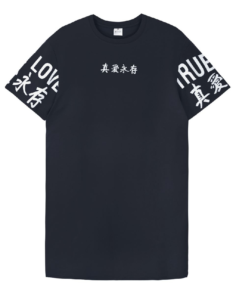 Платье женское свободного силуэта, со спущенным плечом коротким рукавом. Горловина круглая, обработана воротником из кашкорсе. Горловина спинки внутри укреплена бейкой из кулирки. По горловине полочки отделочная строчка. Низ изделия и рукавов обработан швом в подгибку. На рукаве принт Шелкография. Надпись переводится как "Настоящая любовь навеки". Модель рассчитана на рост 164-170см.