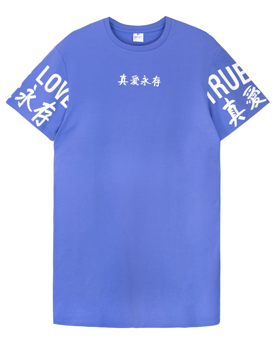 Платье женское свободного силуэта, со спущенным плечом коротким рукавом. Горловина круглая, обработана воротником из кашкорсе. Горловина спинки внутри укреплена бейкой из кулирки. По горловине полочки отделочная строчка. Низ изделия и рукавов обработан швом в подгибку. На рукаве принт Шелкография. Надпись переводится как "Настоящая любовь навеки". Модель рассчитана на рост 164-170см.