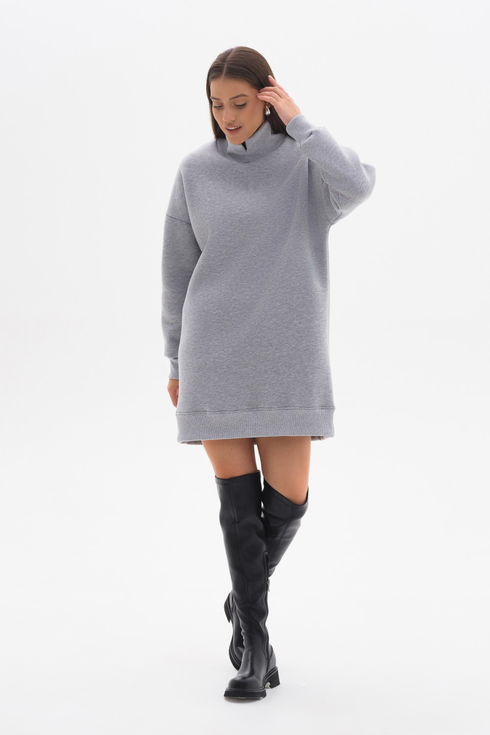 Платье, длиной мини из мягкого шелковистого футера с начёсом с воротником-стойка, спущенной линией плеч и объемными длинными рукавами на манжете. Можно сочетать как с брюками, так и носить отдельно. В нём вы всегда будете выделяться, ведь красота в простоте. Все эти детали делают эту модель особенной привлекательной, выглядит очень эффектно и стильно.