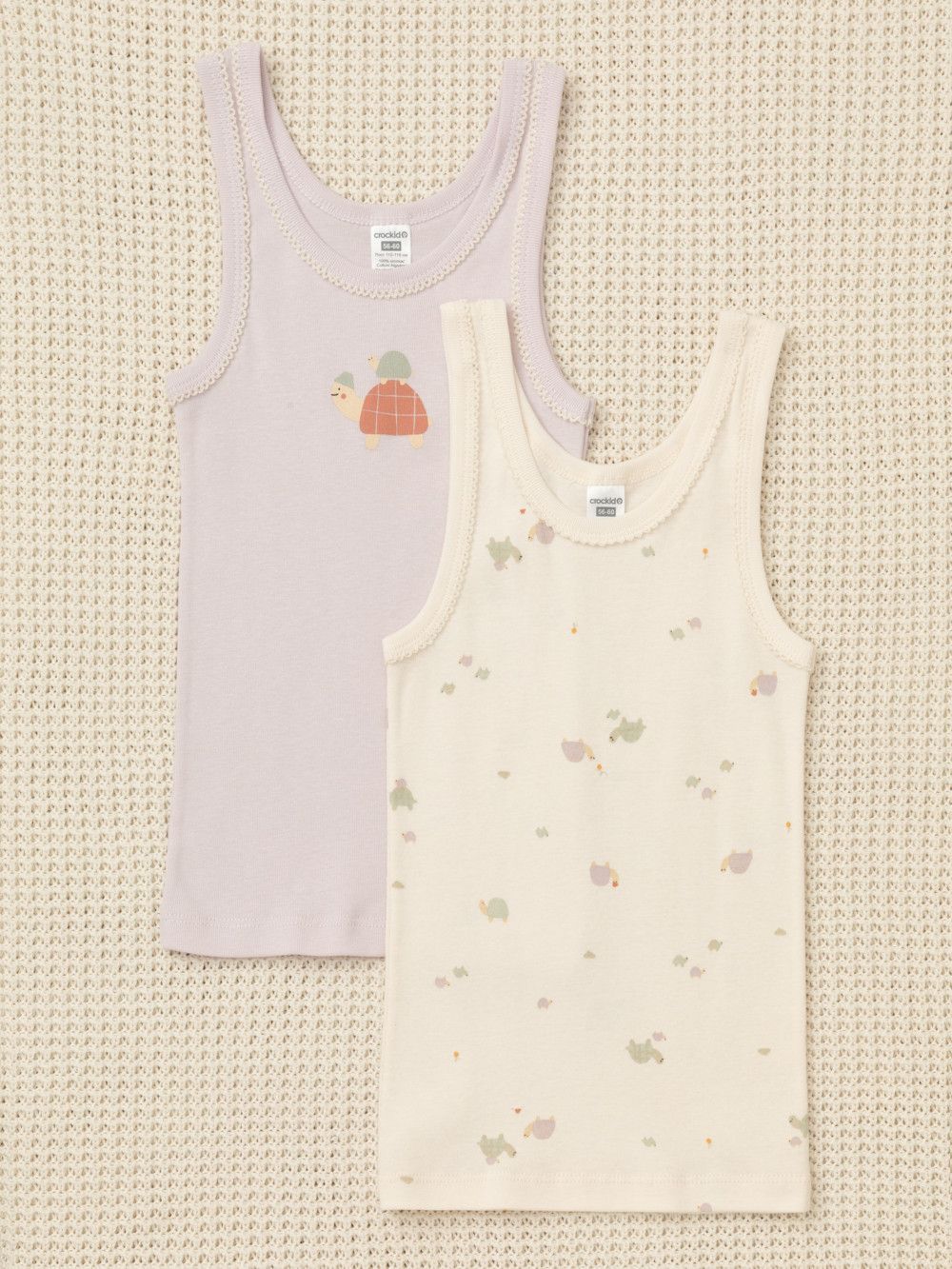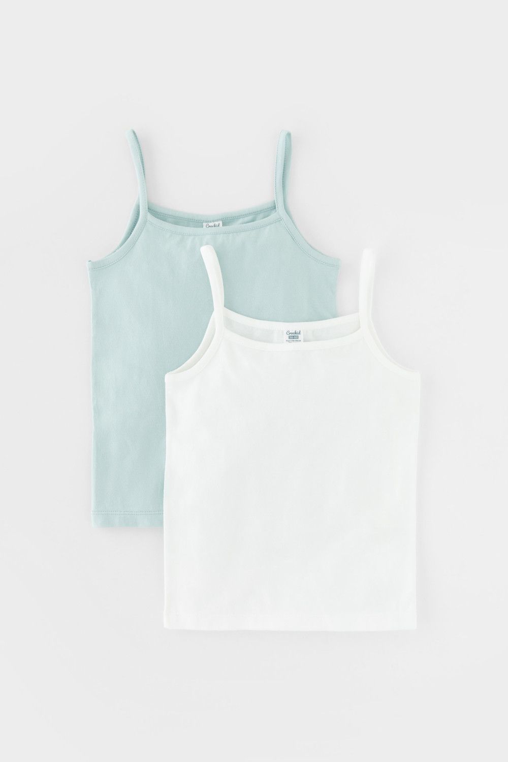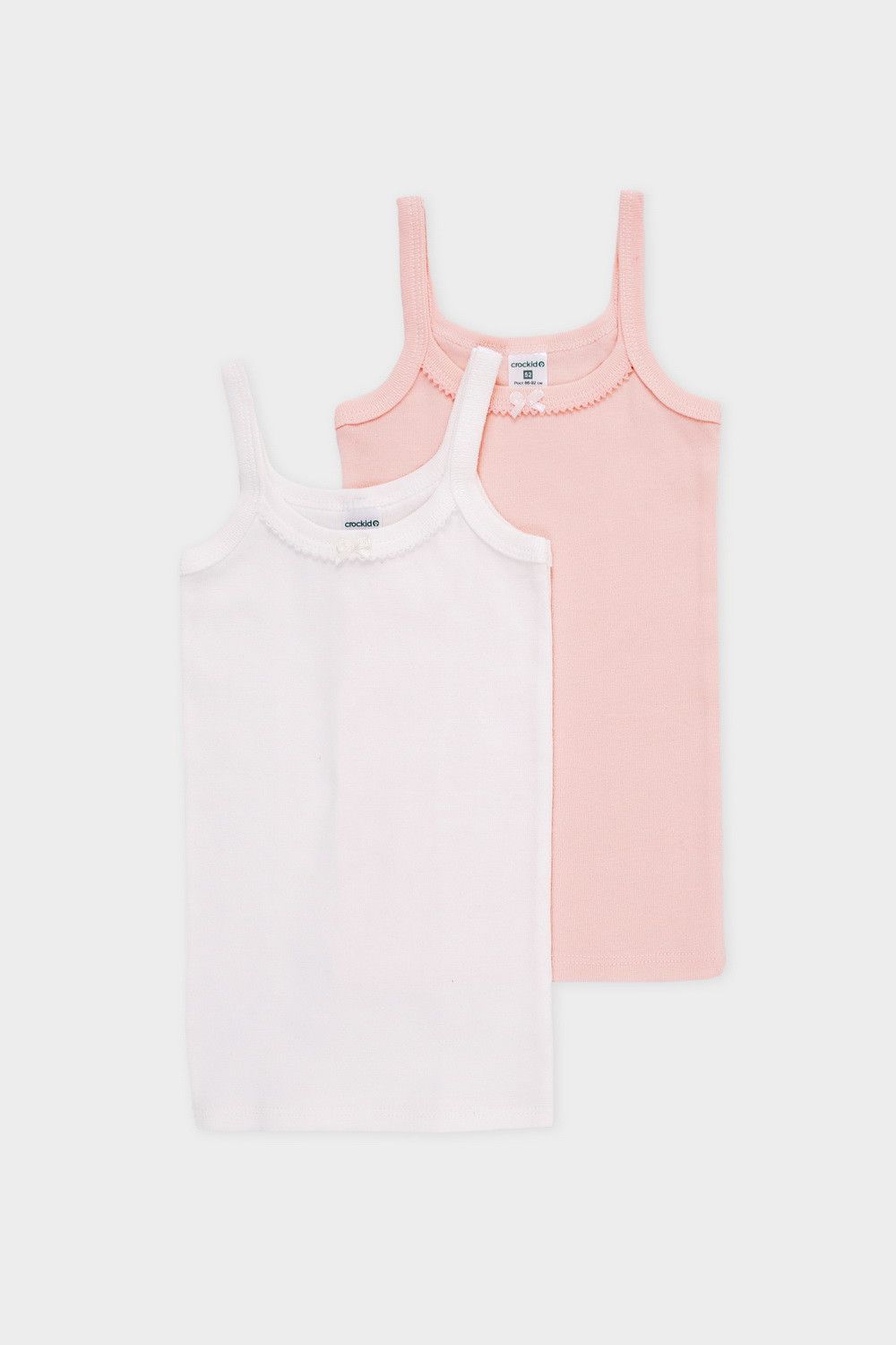 Состав: 92% хлопок, 8% эластан. Трикотажные майки в комплекте 2 шт на тонких бретелях из однотонной рибаны, горловина и проймы обработаны кантом, по горловине полочки мережка и атласный бантик. Сохраняют цвет и форму после многократных стирок. Все трикотажные полотна производятся в соответсвии с нормами Швейцарского сертификата ЭкоТекс.