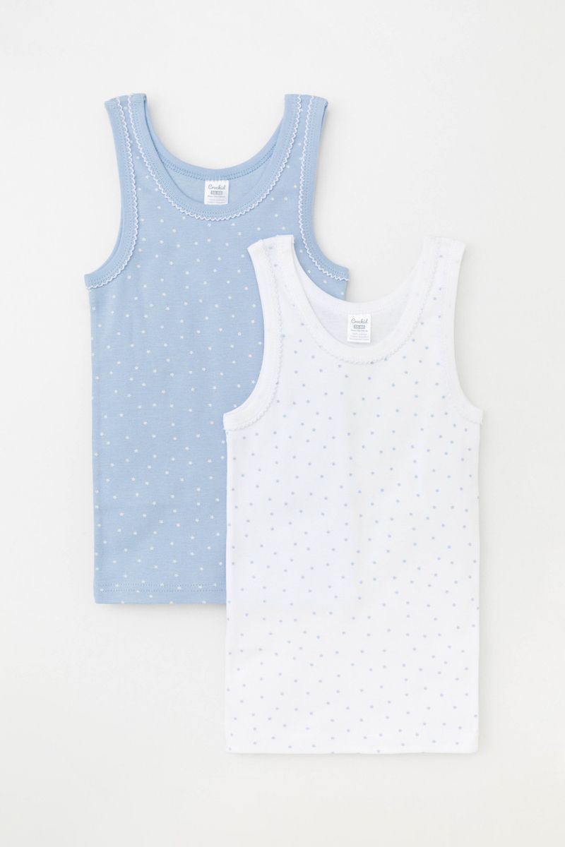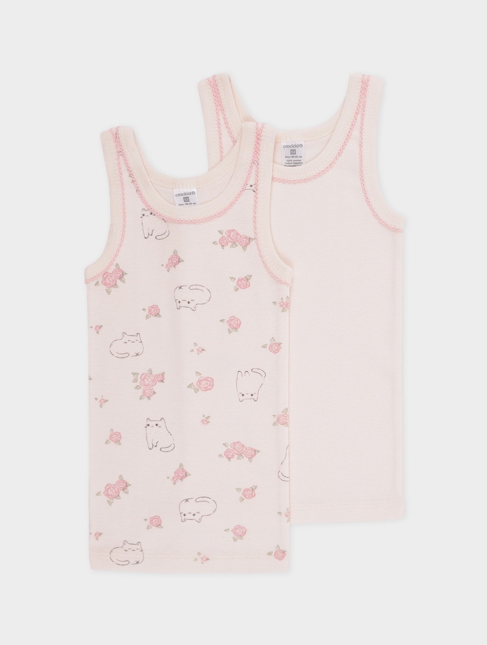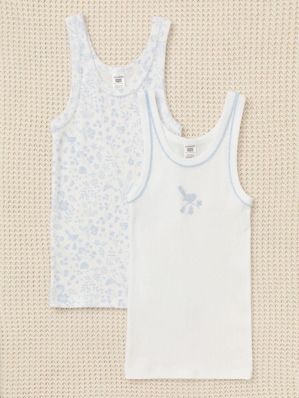 Состав: 92% хлопок, 8% эластан. Трикотажные майки в комплекте 2 шт на тонких бретелях из однотонной рибаны, горловина и проймы обработаны кантом, по горловине полочки мережка и атласный бантик. Сохраняют цвет и форму после многократных стирок. Все трикотажные полотна производятся в соответсвии с нормами Швейцарского сертификата ЭкоТекс.