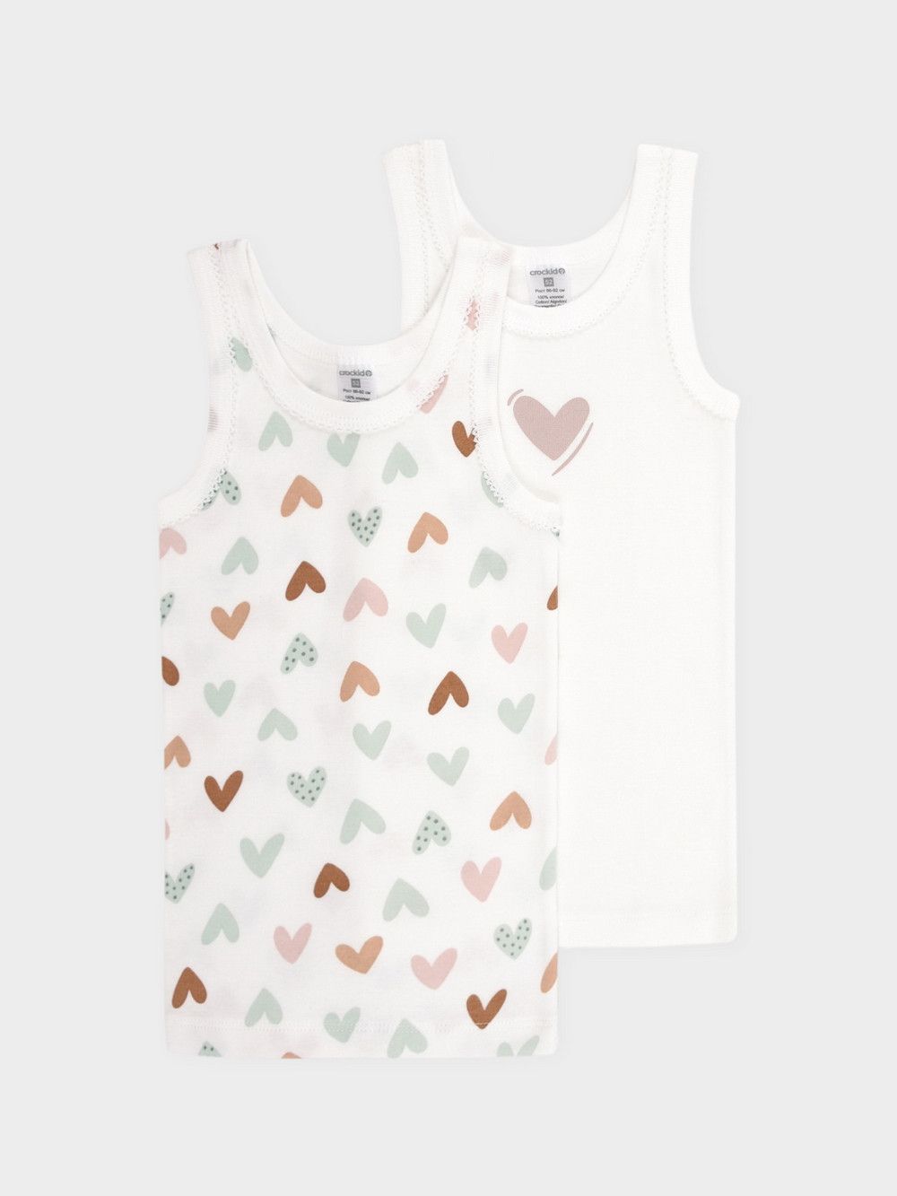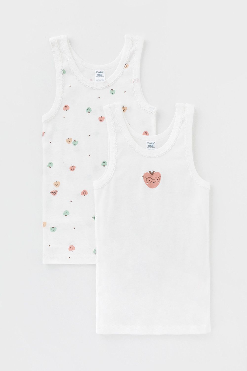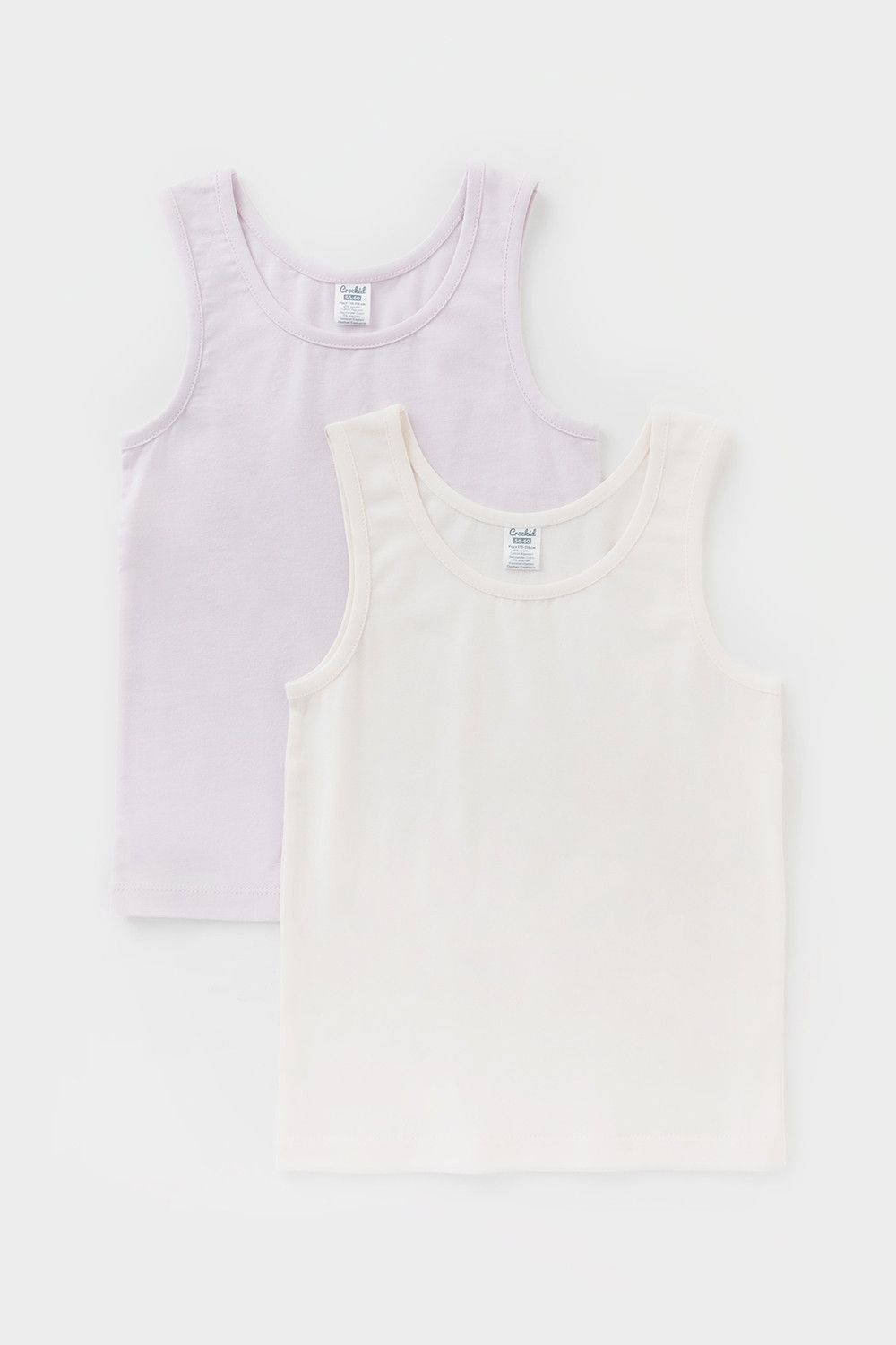 Состав: 100% хлопок. Трикотажные майки в комплекте 2 шт на тонких бретелях из однотонной рибаны, горловина и проймы обработаны кантом, по горловине полочки мережка и атласный бантик. Сохраняют цвет и форму после многократных стирок. Все трикотажные полотна производятся в соответсвии с нормами Швейцарского сертификата ЭкоТекс.
