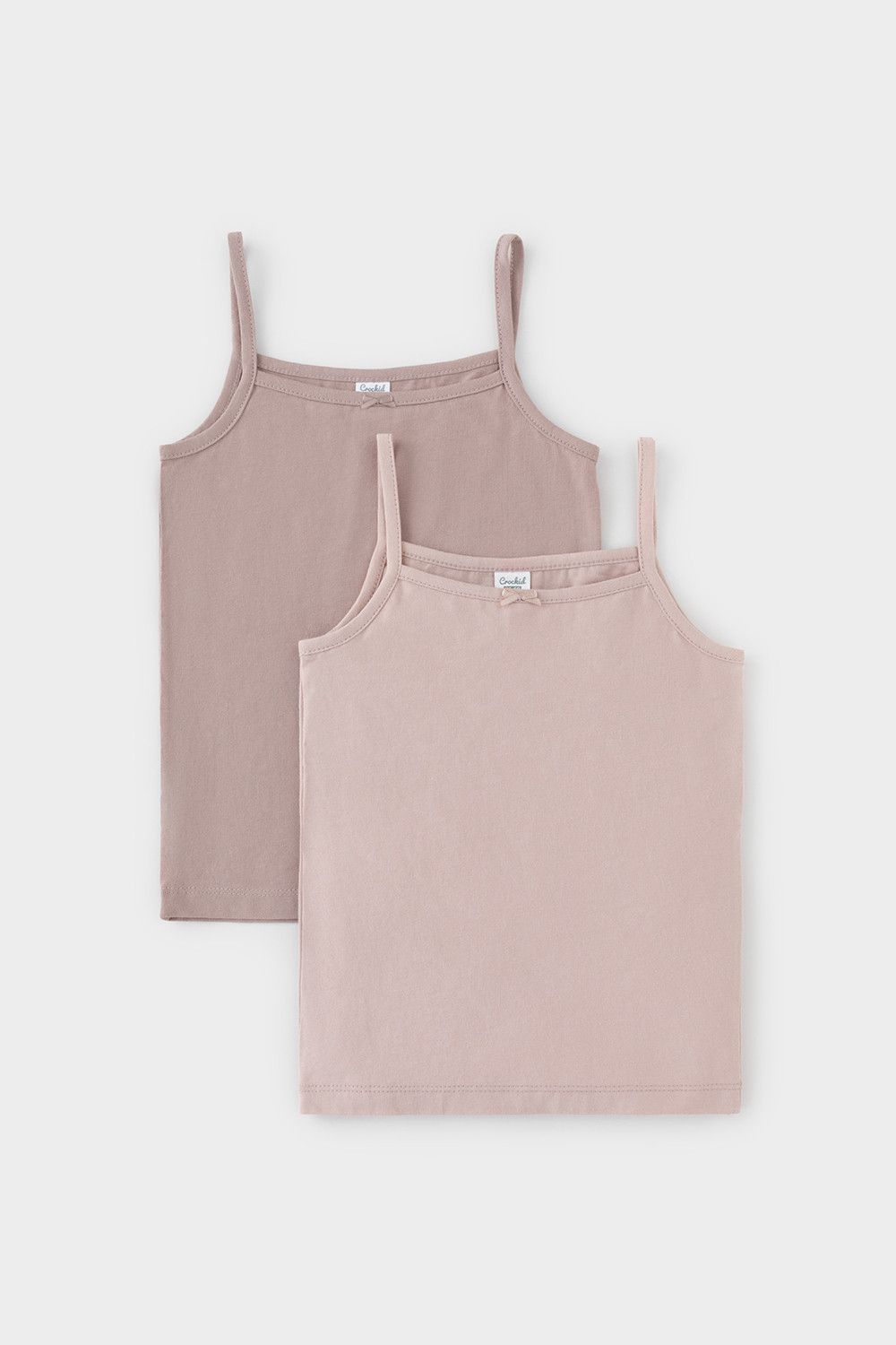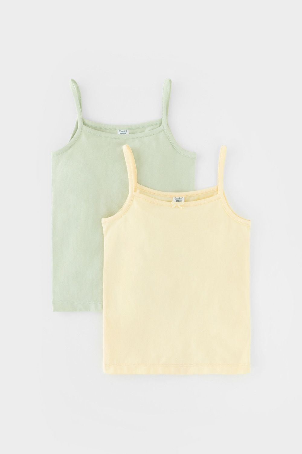 Состав: 92% хлопок, 8% эластан. Трикотажные майки в комплекте 2 шт на тонких бретелях из однотонного супрема с эластаном, горловина спинки и проймы обработаны кантом, по горловине полочки декоративная эластичная тесьма и атласный бантик. Сохраняют цвет и форму после многократных стирок. Все трикотажные полотна производятся в соответсвии с нормами Швейцарского сертификата ЭкоТекс.