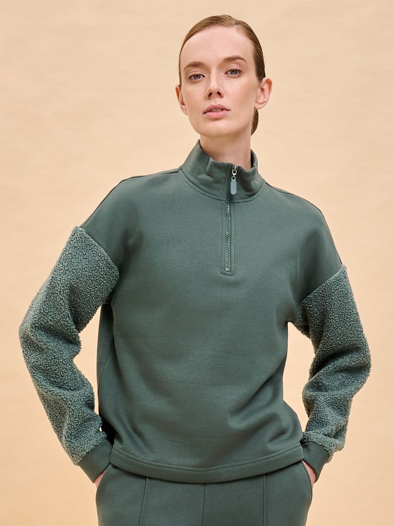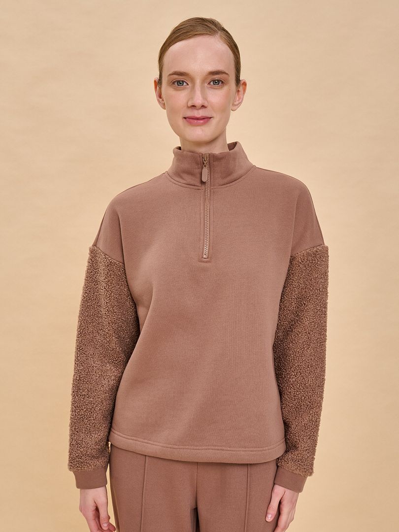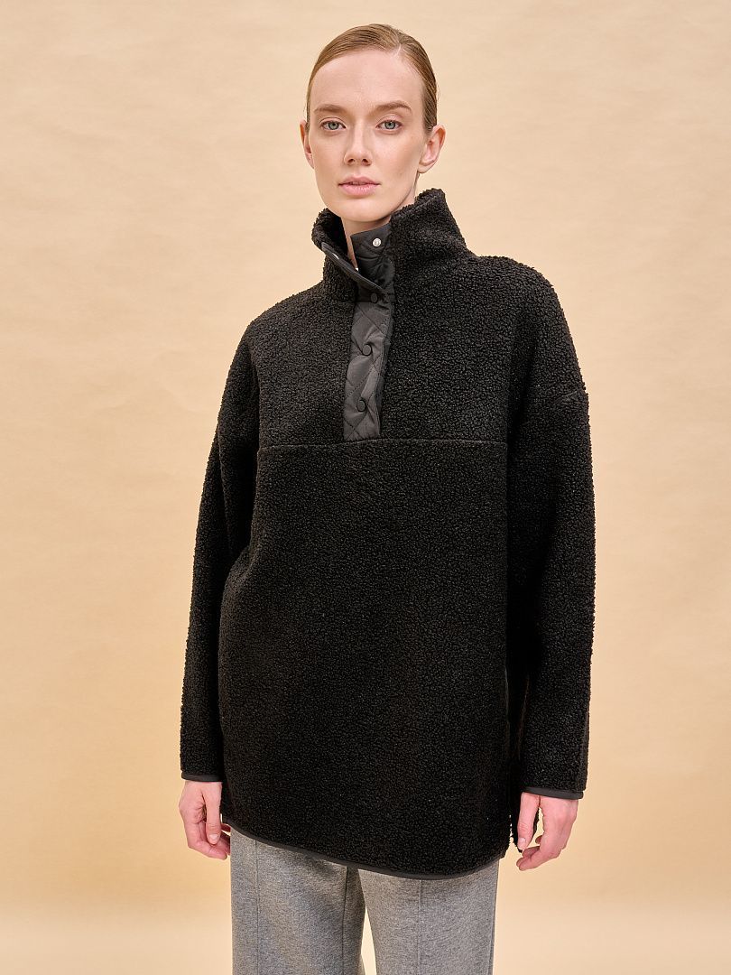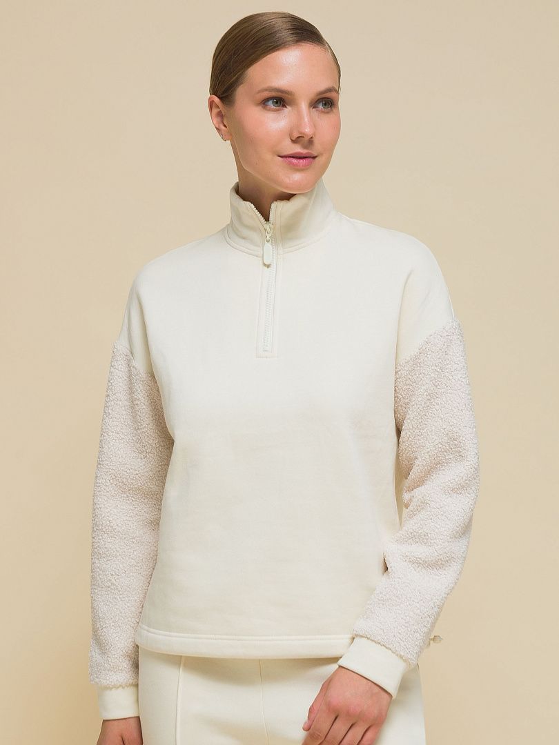 Состав: 60%хлопок 40%полиэстер, вставка: 100%полиэстер Стильный женский свитшот свободного силуэта со спущенным плечом. Толстовка без капюшона выполнена в комбинации двух материалов: гладкого футера и фактурного меха «барашек». Это актуальный модный тренд. Толстовка с воротником-стойкой. Он защитит от холода и ветра. Застёжка на короткую молнию — удобно и быстро застёгивать и расстёгивать. По низу удобная кулиска — можно регулировать объём и посадку. Свитшот однотонный, без принта. Изделие неприхотливо в уходе, его легко стирать, ткань быстро сохнет и не склонна к образованию катышков. В составе основной ткани (футкер с начесом) преобладает качественый хлопок — толстовка мягкая, отлично дышит. Рукава выполнены из мягкого и приятного на ощупь бербер-флиса (фактура «барашка»). Свитшот представлен в двух универсальных цветах: чёрном и молочном. Его легко сочетать с различными моделями брюк. Размерная линейка: XS (42); S (44); M (46); L (48). Толстовка идеальна как для женщин, так и для девушек и девочек-подростков. Подходит и высоким, и невысоким девушкам. Оверсайз-свитшот — прекрасный выбор для повседневной носки и активного отдыха. Он тёплый, лёгкий и мягкий. Для круглогодичного применения: прохладным летом, осенью, зимой, весной и демисезон. Это модный и практичный подарок для сестры, подруги или дочки на любой праздник.