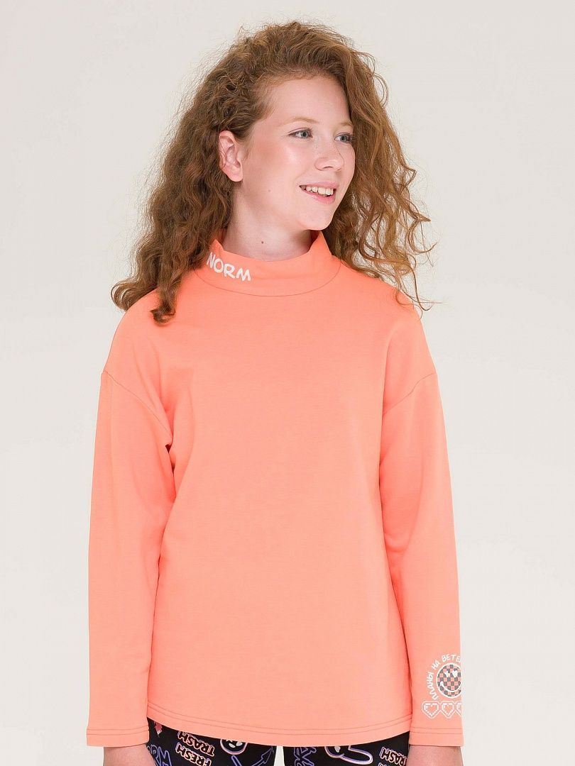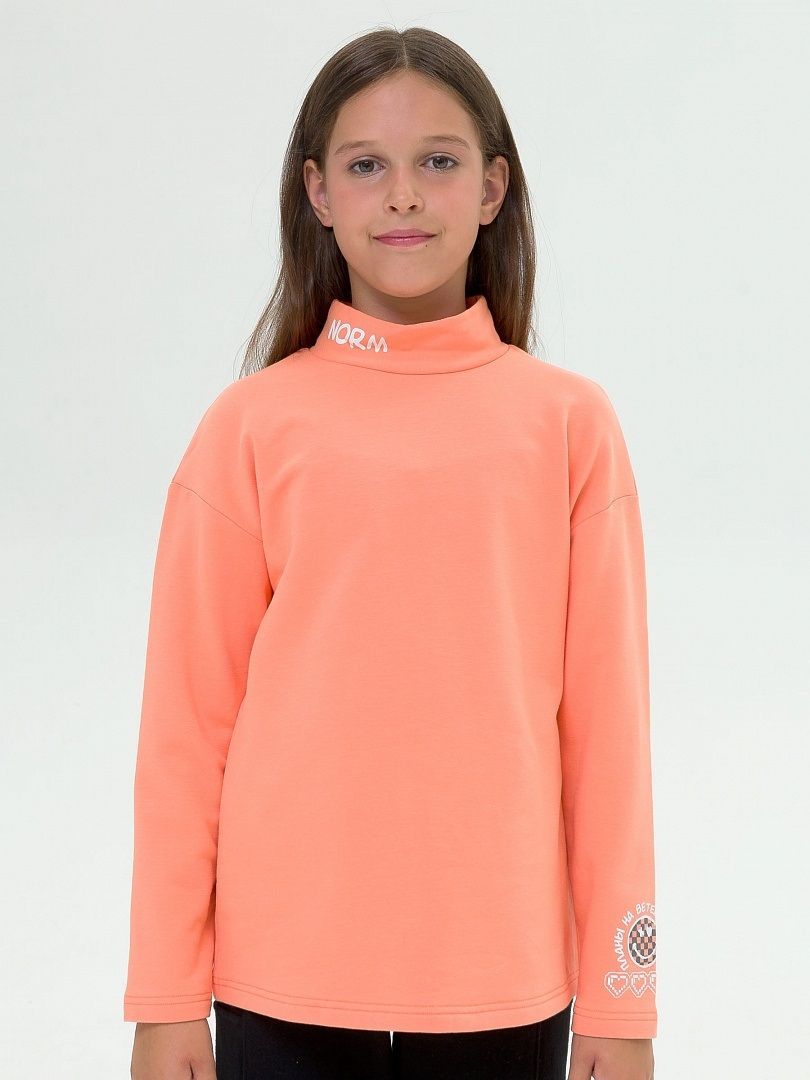 Состав: 95%хлопок 5%эластан Водолазка из футера с начесом для девочки. Ткань мягкая, с большим содержанием хлопка, приятная на ощупь и простая в уходе. Мягкое спущенное плечо и прямой силуэт. Воротник-стойка из основной ткани. Близкий детям и подросткам принт на воротнике и рукаве – надпись NORM, прикольные иконки и смайлы. Тепло, мягко, уютно – водолазка подходит на каждый день для создания стильного образа. Комбинируется с жилетом, толстовкой, анораком.