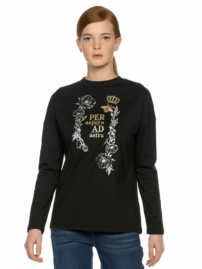 Состав: 100%хлопок Модный лонгслив для женщин из 100% хлопка умеренного объема со спущенным плечом - всегда актуальный силуэт. Ткань мягкая, дышащая, приятная на ощупь. Украшение джемпера - богатый актуальный принт из золотого и серебряного металлика и броши в виде мотылька, вышитого золотыми нитками, бисером и стразами. Лонгслив идеально подойдет как для повседневной носки, так и на выход.