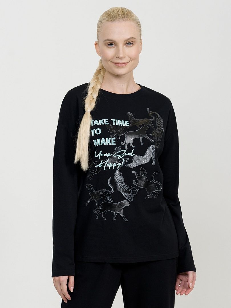 Состав: 95%хлопок 5%эластан Лонгслив среднего объема. Крупный эластичный glossy принт на полутонах. Перевод Найдите время, чтобы сделать свою душу счастливой.