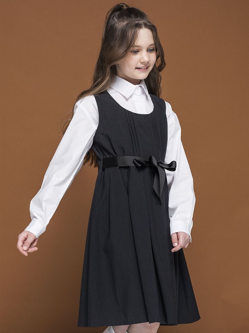 Состав: 52%вискоза 48%полиэстер Сарафан для девочки в темно-синем цвете. Подойдет в качестве повседневного элемента школьной формы. Изделие соткано из двух частей, свободно сидит и не имеет застежки. Грудка декорирована вертикальными строчками, а в юбку заложено шесть складок, чтобы сделать изделие комфортным и свободным. Спинка цельная, книзу чуть расширяется, объем хорошо регулируется репсовой тесьмой, которую можно завязать на бант.