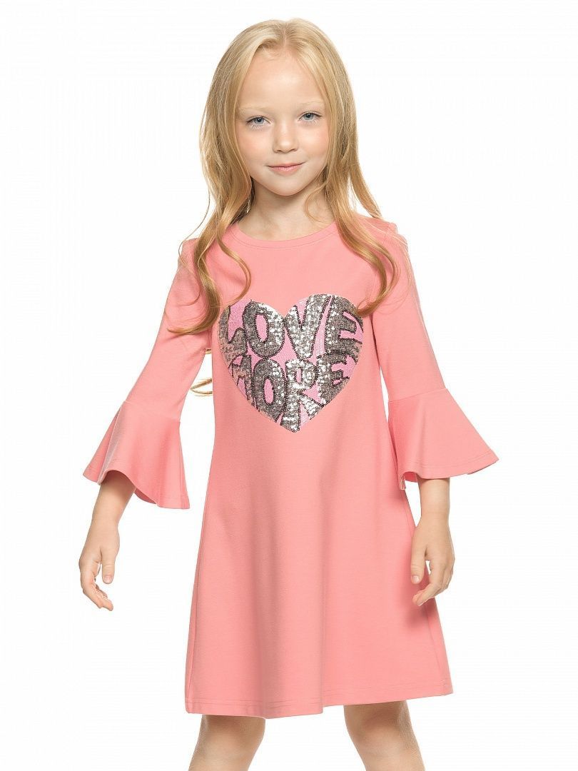 Состав: 60%вискоза 35%полиамид 5%эластан Нарядное платье пудрового цвета трапециевидного силуэта. Рукав втачной, длиной три четверти, небольшого объема с отрезным воланомконического разведения. Декор аппликацией в видесердца из пайеток розового и серебряного цветов.