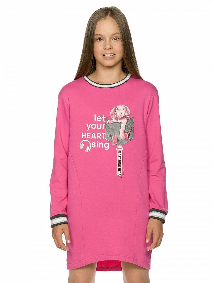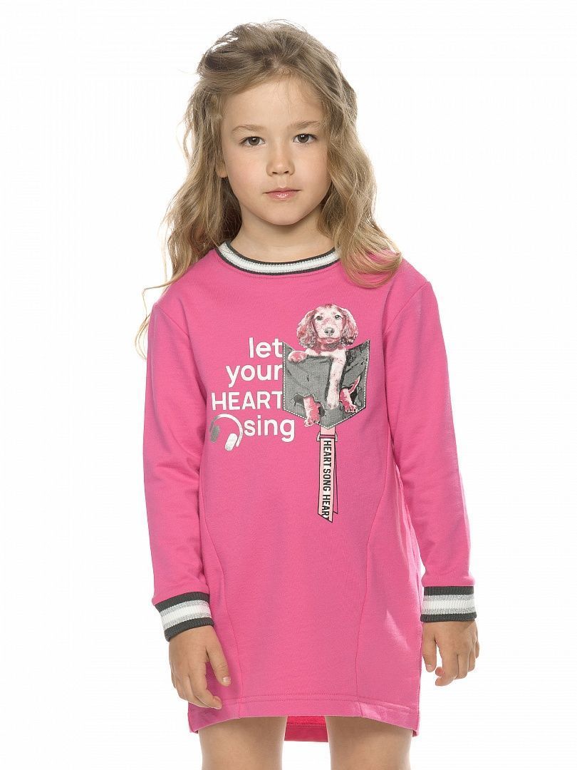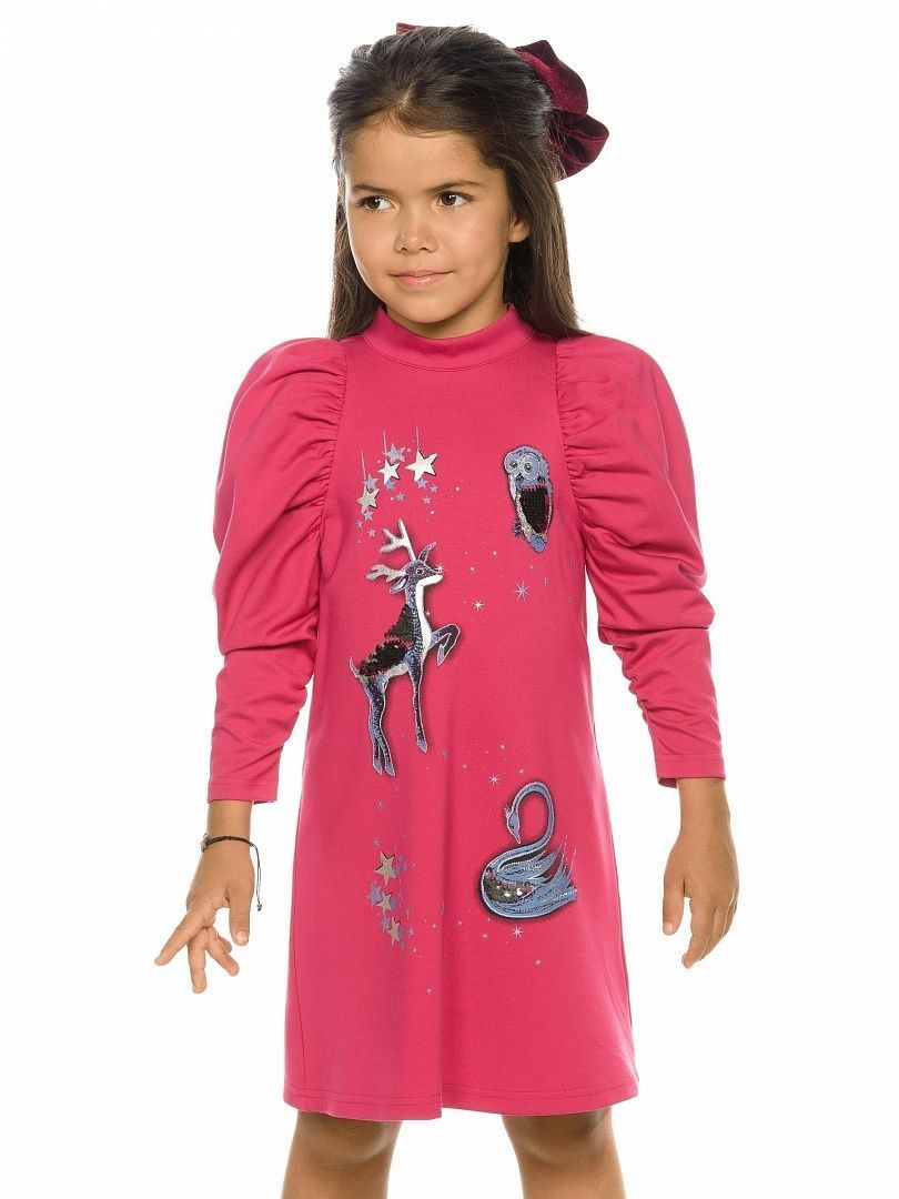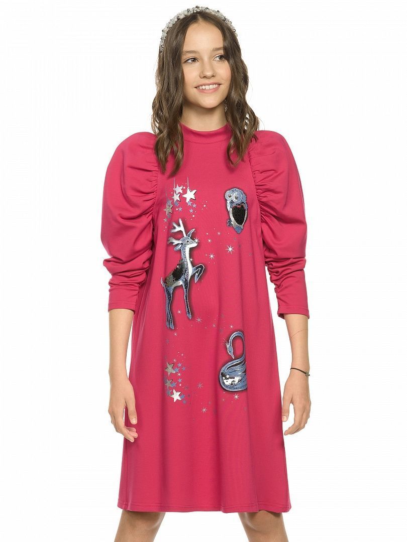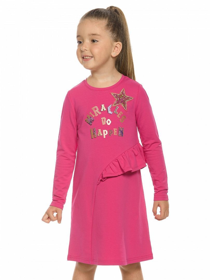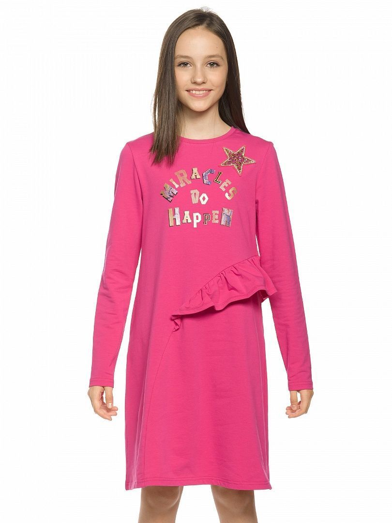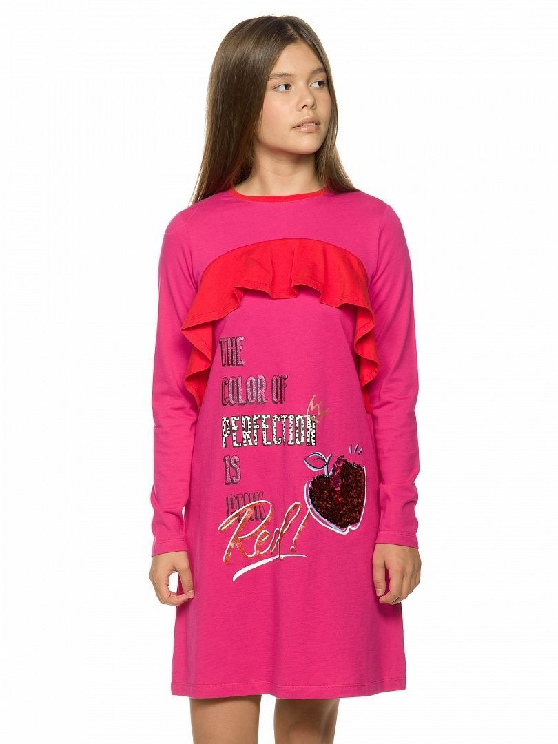 Состав: 100%хлопок Платье для девочек модного А-силуэта с небольшим объёмом в плечевой зоне, в области груди втачной волан контрастного цвета, аппликация в виде яблока из двусторонних пайеток, надпись с глиттером, перевод Цвет совершенства: розовый/красный!