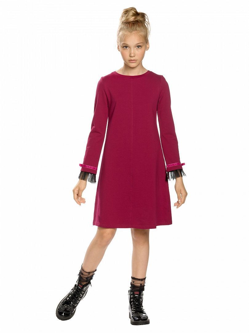 Состав: 96%хлопок 4%эластан Платье для девочек. Новинка кроя! Платье из эластичного футера, силуэт-трапеция: в верхней части более прилегающее, к низу более расширенное. Облегающие рукава вверху, расширяются к низу; по низу рукавов плиссированная сетка с настроченной бархатной лентой и бантиком; декоративный центральный шов по переду изделия.
