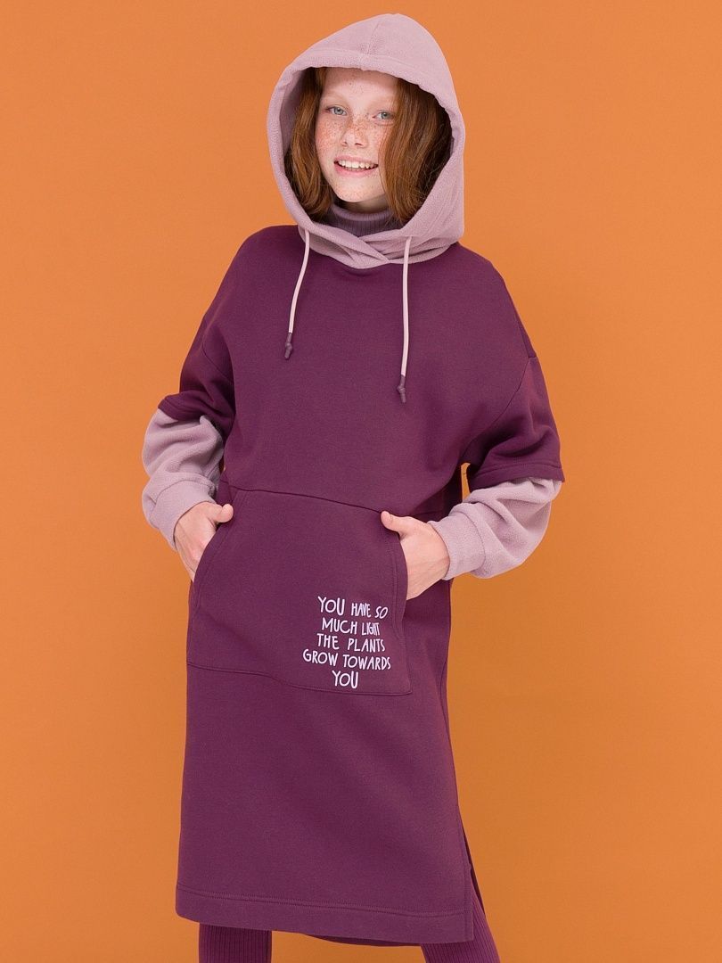 Состав: 72%хлопок 28%полиэстер, вставка: 100%полиэстер Платье с капюшоном для девочки оверсайз. Платье толстовка на девочку с длинным рукавом, свободного прямого кроя, удлиненное ниже колена, с разрезиками внизу, накладной карман кенгуру с принтом надпись. С эффектом многослойности - часть рукава и капюшон на шнуре выполнены из контрастного цвета. Базовый вариант детского гардероба из бербер-флиса для осени и зимы. Для современных девочек комфортная и универсальная свободная детская одежда вышла на первый план. Просторное теплое детское спортивное платье для подростка не сковывает движений, в нем удобно бегать, прыгать при этом выглядеть по-девичьи. Утепленное платье создано для активной жизни ребенка. Зимнее платье идеальный вариант для детей для повседневной носки на каждый день, подойдет на прохладную погоду, в нем можно много гулять, а от ветра защитит капюшон.