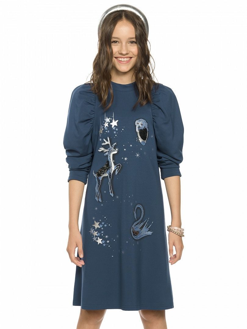 Состав: 60%вискоза 35%полиамид 5%эластан, вставка: 100%хлопок Нарядное платье, слегка расширенное к низу. Горловину украшает изящная стойка, застёжка на две пуговицы по спинке. Фишка платья в пышных рукавах, объём которых достигнут за счет густой сборки оката. Сборка рукава по внутреннему шву на эластик позволяет регулировать длину. Перед декорирован сказочным принтом с серебряным металликом и пайетками.