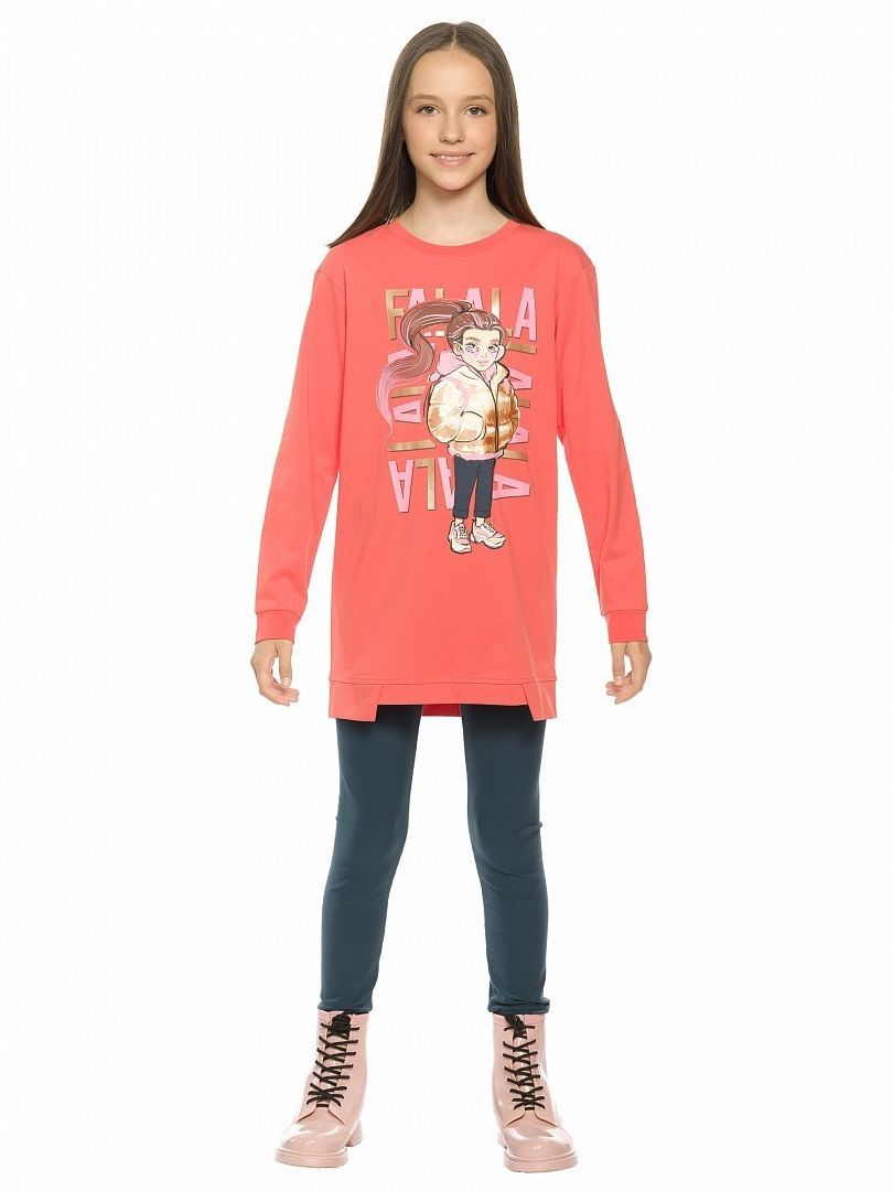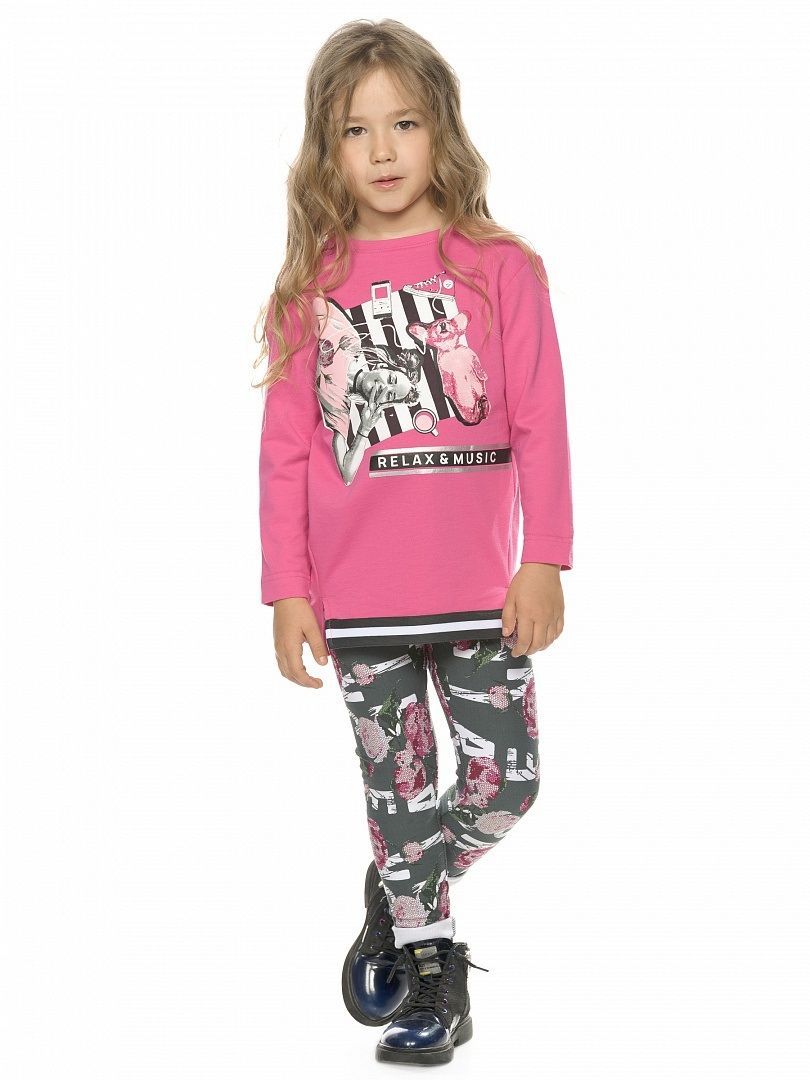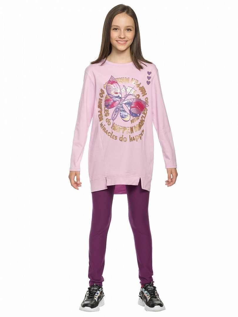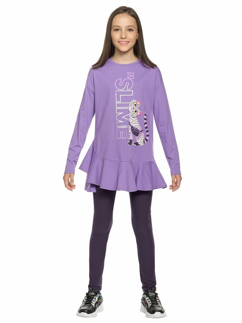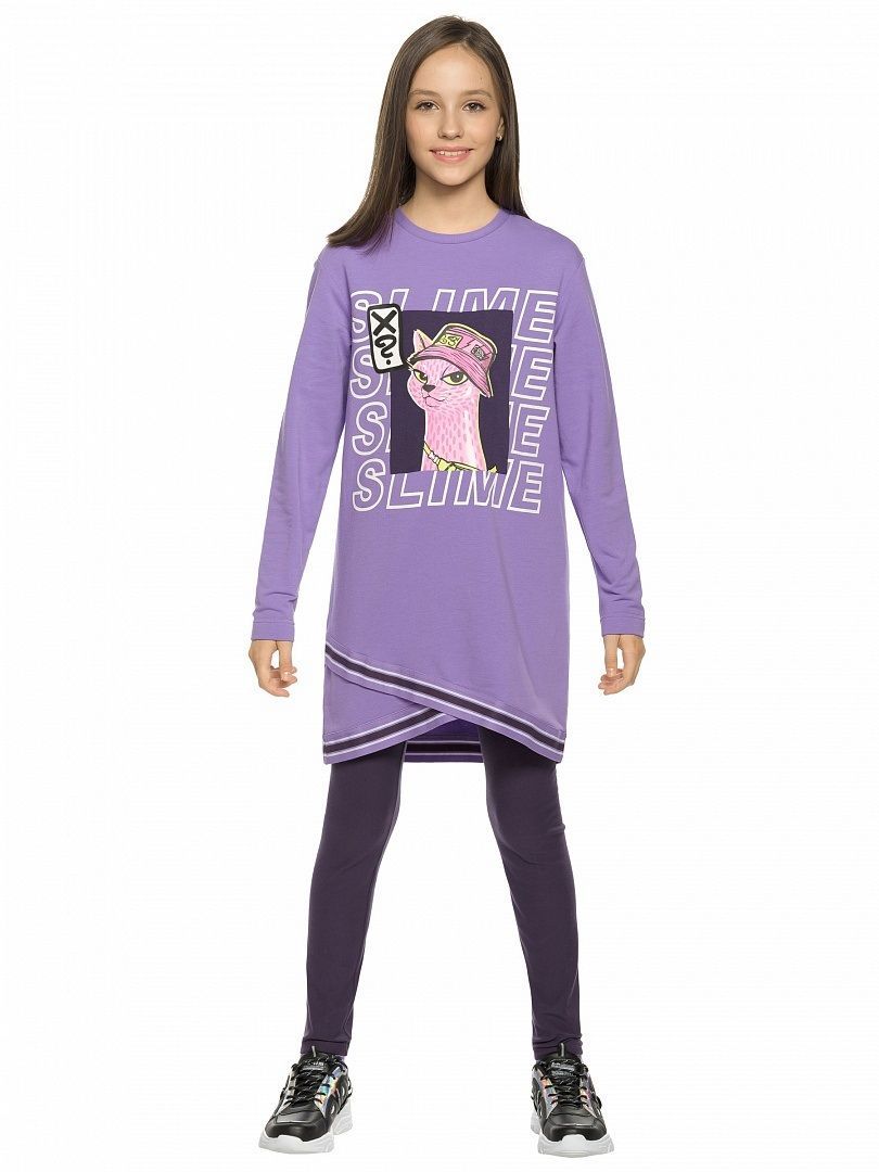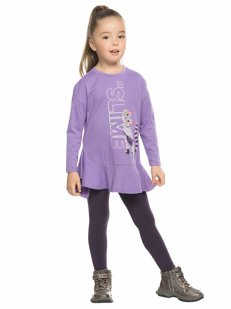 Состав: верх: 96%хлопок 4%эластан, низ: 96%хлопок 4%эластан Комплект для девочек туника и лосины. Туника из футера О силуэта со спущенным плечом. Низ изделия фигурный, декорирован эластичной тесьмой. Стойкий принт с неоном. Надпись на панаме Клёвый образ. Утепленные лосины с начесом.