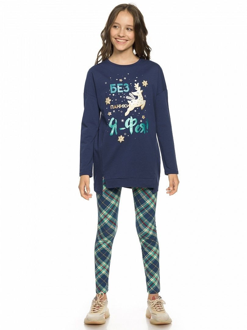 Состав: верх: 100%хлопок, низ: 93%хлопок 7%эластан Комплект для девочек. Туника О образного силуэта с перепадом длин между передом и спинкой, спущенное плечо, боковые швы переведены на перед, оканчиваются небольшими разрезами. Принт в виде пряничного оленя, с золотом, бирюзовым глиттером и металликом, стразами. Классические лосины в All over принт клетку.