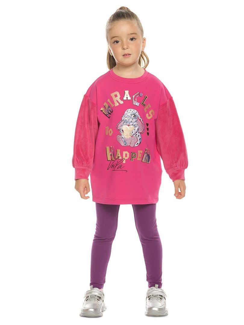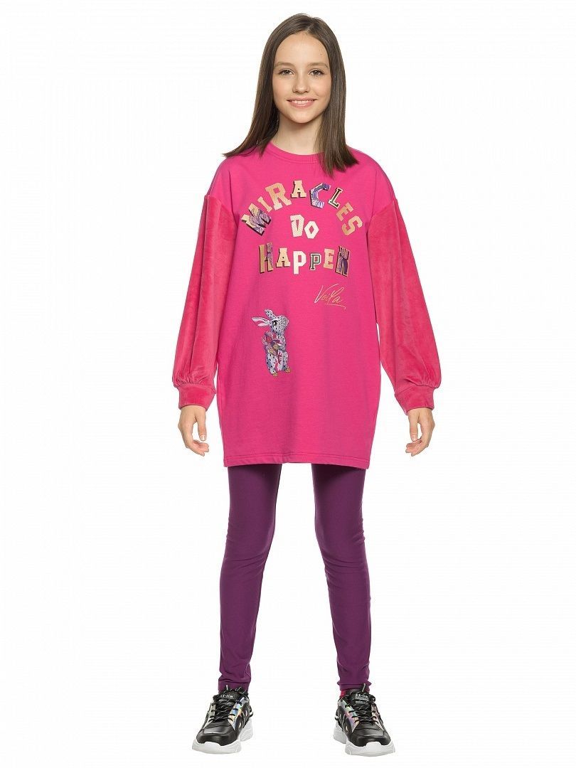 Состав: верх: 96%хлопок 4%эластан, вставка: 95%полиэстер 5%эластан, низ: 95%хлопок 5%эластан Комплект для девочек туника и лосины. Туника мягкого оверсайз силуэта со спущенной линией плеча. Перед и спинка из футера, рукава из мягкого плюшевого велюра с перламутровым отблеском. Эластичный rubber принт с золотым металликом и глиттером. Надпись Чудеса случаются. Вуаля. Низ Классические лосины из футера с начесом.