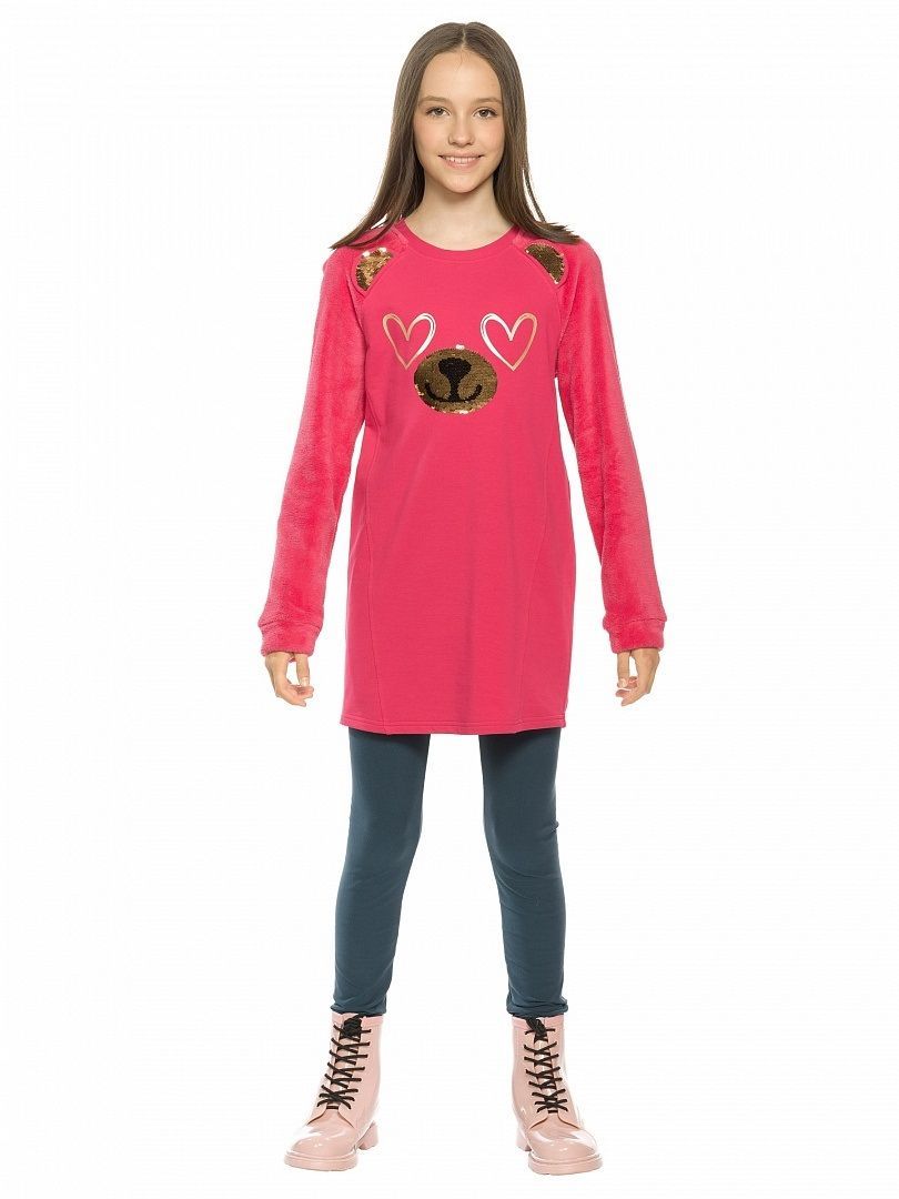Состав: верх: 96%хлопок 4%эластан, вставка: 100%полиэстер, низ: 95%хлопок 5%эластан Комплект для девочек туника и лосины. Туника из футера с рукавами реглан из велсофта. На переде рельефные швы, создающие силуэт лёгкий бочонок. В швах рукава вшиты декоративные ушки, расшитые золотистыми пайетками. По переду принт из мягких стойких золотых сердечек и вышивки из пайеток, имитирующие мордочку медведя. Лосины из эластичного футера с начесом.