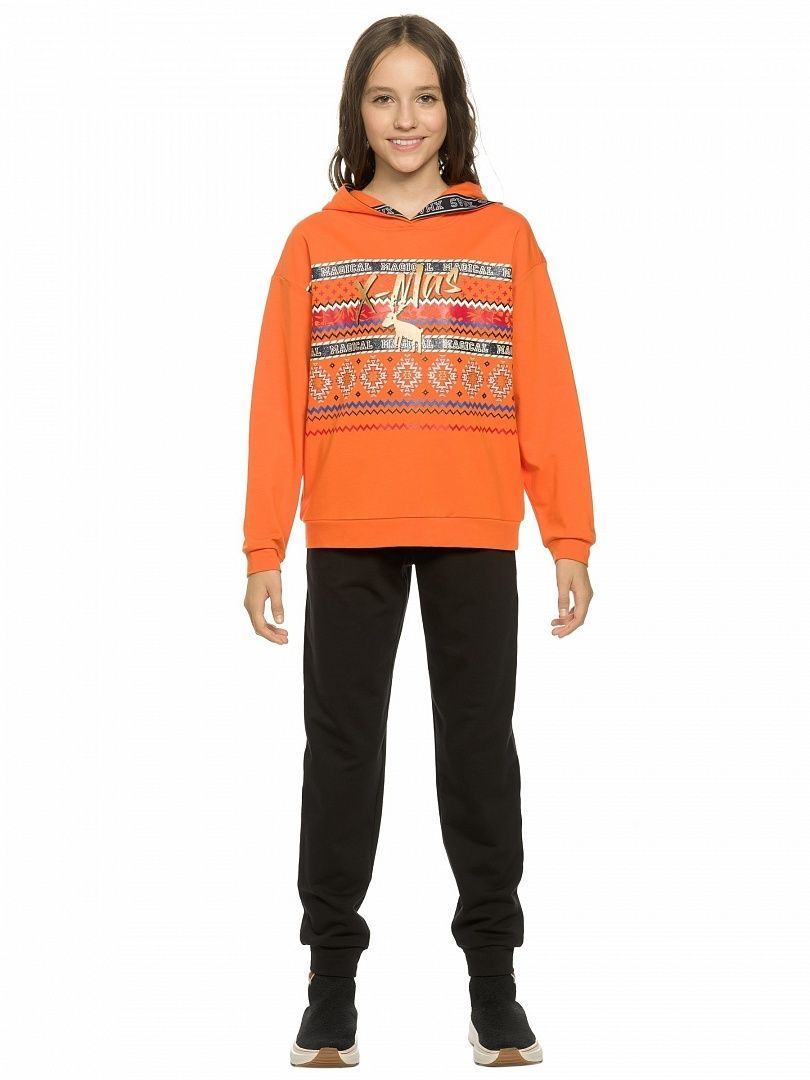 Состав: верх: 96%хлопок 4%эластан, низ: 96%хлопок 4%эластан Комплект для девочек. Худи из футера оверсайз силуэта. Капюшон изнутри отделан декоративной тесьмой с вытканным рисунком, перевод Рождество. Линия плеча спущена, манжеты по низу рукавов и изделия из основной ткани. Rubber принт с золотом и глиттером. Перевод Волшебное Рождество. Брюки из футера умеренного объема с манжетами и поясом из основной ткани, карманы в боковых швах.
