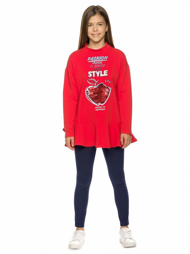 Состав: верх: 96%хлопок 4%эластан, низ: 95%хлопок 5%эластан Костюм для девочек из футера: туника и лосины. Новинка кроя! Туника более свободного силуэта со спущенным плечом, рукава, слегка зауженные книзу, по низу изделия разноуровневый волан, поднимающийся вверх по правому боковому шву, аппликация в виде яблока из двусторонних пайеток, надпись с глиттером и золотистым блеском, перевод Мода выбирает сиять со стилем. Одевайся так, чтобы произвести впечатление. Утеплённые лосины из футера увеличенной формы для удобства надевания.