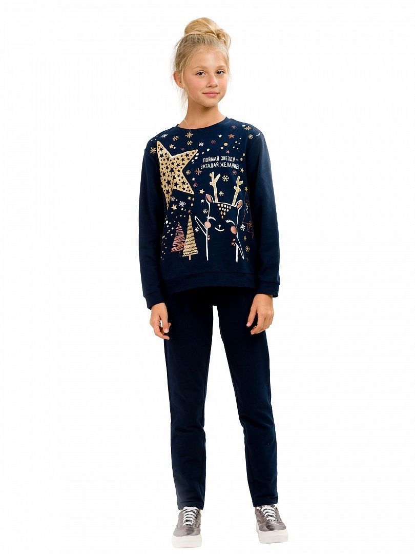 Состав: верх: 96%хлопок 4%эластан, низ: 96%хлопок 4%эластан Комплект для девочек: толстовка и брюки. Комплект из футера. Толстовка среднего объёма, со спущенным плечом. Центральный принт в необычной стилизованной графике с розовым золотом и золотой посыпкой, надпись "Поймай звезду - загадай желание!" уносит в сказочную атмосферу. Манжеты из основной ткани на рукавах и по низу изделия. Брюки слегка заужены к низу, регулировка объема по талии шнурком.
