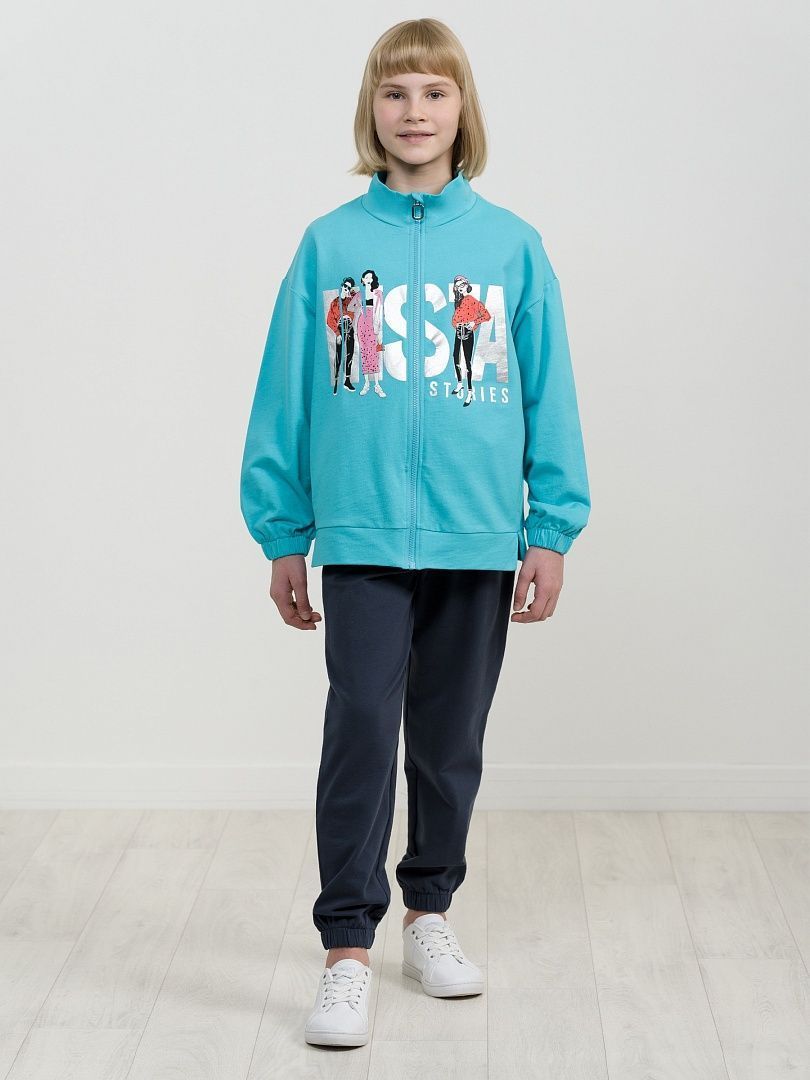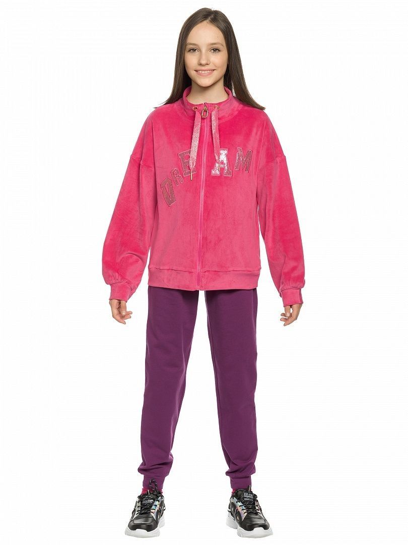 Состав: верх: 95%полиэстер 5%эластан, низ: 96%хлопок 4%эластан Комплект для девочек толстовка и брюки. Толстовка оверсайз силуэта из велюрового трикотажного полотна с перламутровым отливом. Слегка расширенный рукав собран на манжету из основной ткани. Воротник стойка с большими металлическими люверсами и декоративными лентами с люрексом и металлическими наконечниками. Застёжка на тракторную молнию с металлическим пуллером. По переду аппликация из пайеток. Перевод Мечта. Брюки из футера на манжете из рибаны актуального увеличенного объема без защипов. Пояс из основной ткани с эластиком внутри и дополнительной регулировкой объема шнурком.