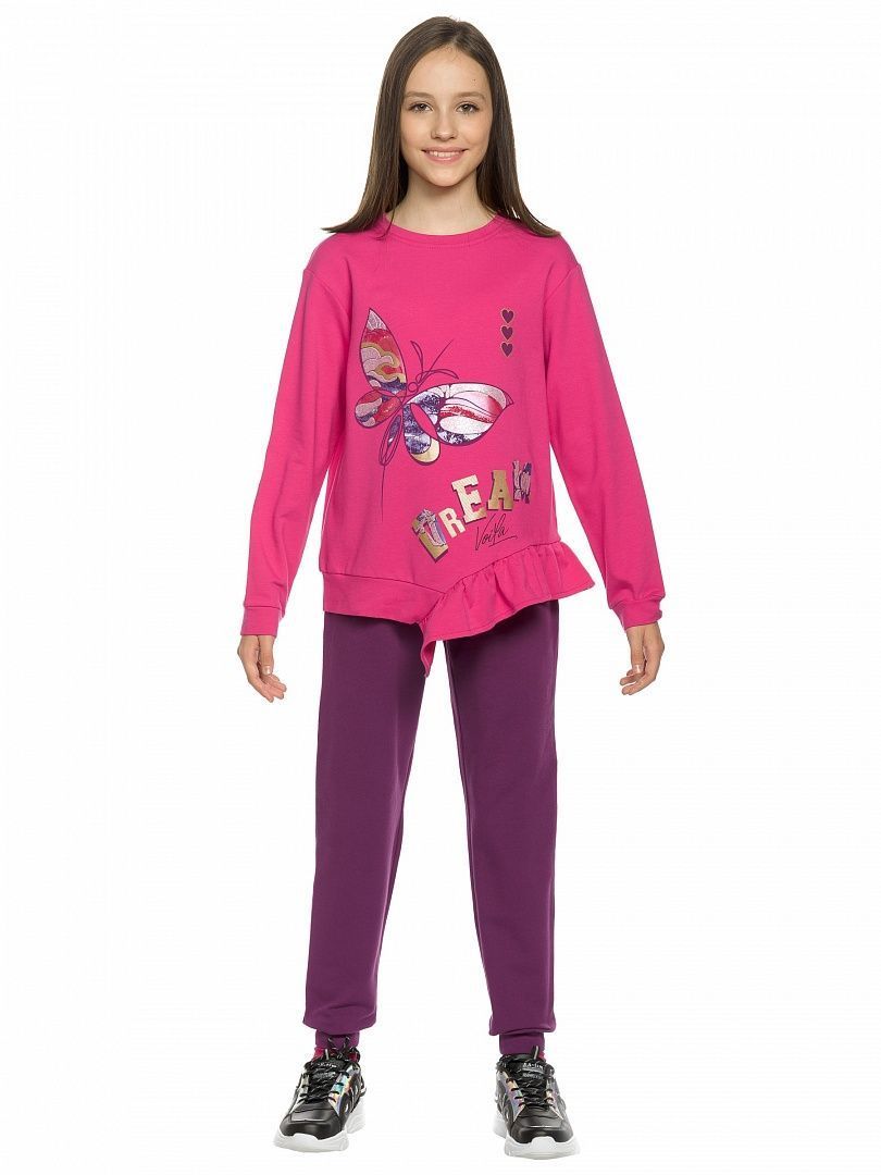 Состав: верх: 96%хлопок 4%эластан, низ: 96%хлопок 4%эластан Комплект из футера для девочек свитшот и брюки. Свитшот расслабленного силуэта. Rubber принт с золотым металликом и глиттером. Надпись Мечта. Вуаля. По низу изделия декоративный, асимметрично расположенный волан из основной ткани. Брюки на манжете из рибаны увеличенного, актуального объема без защипов. Пояс из основной ткани с эластиком внутри и дополнительной регулировкой объема шнурком.