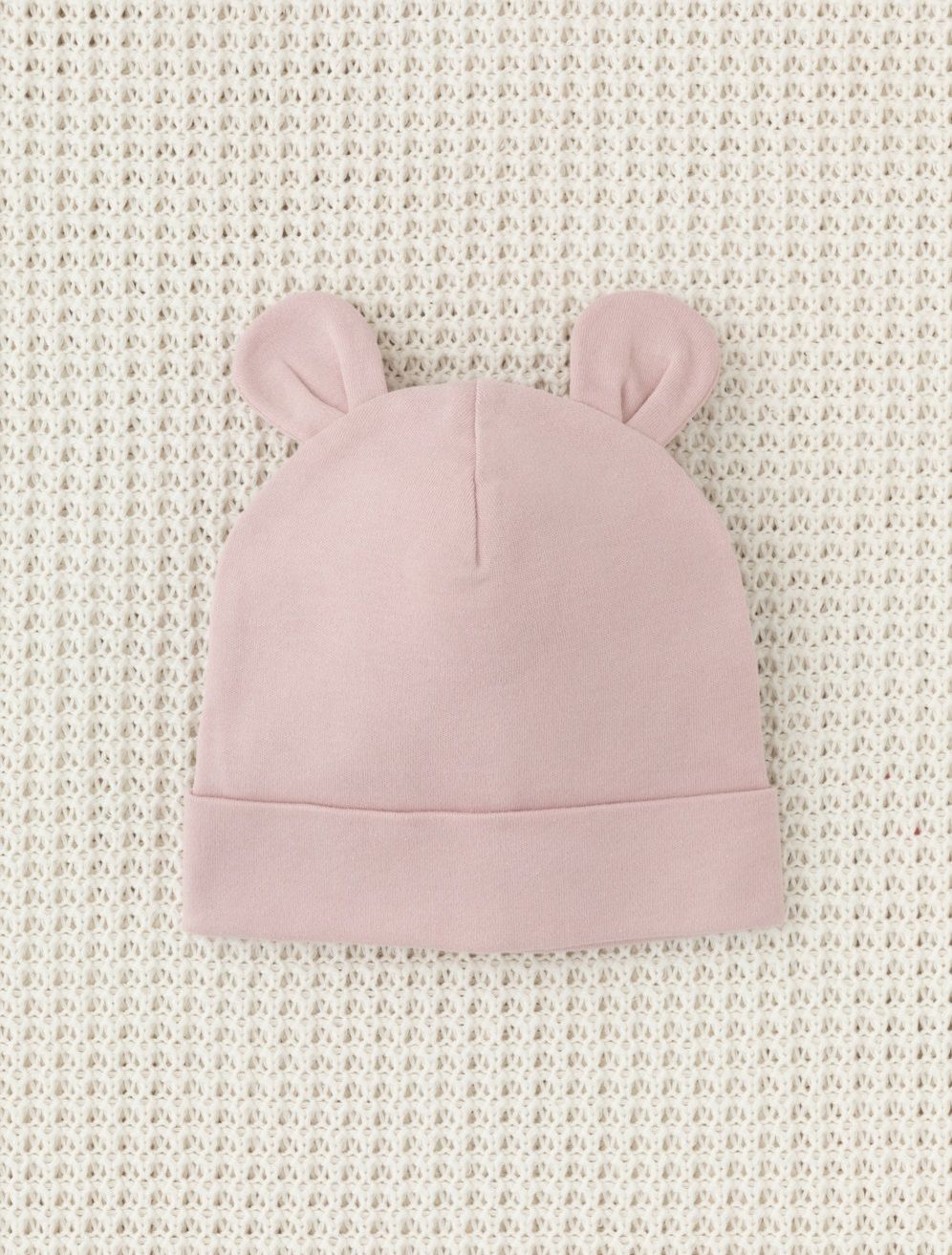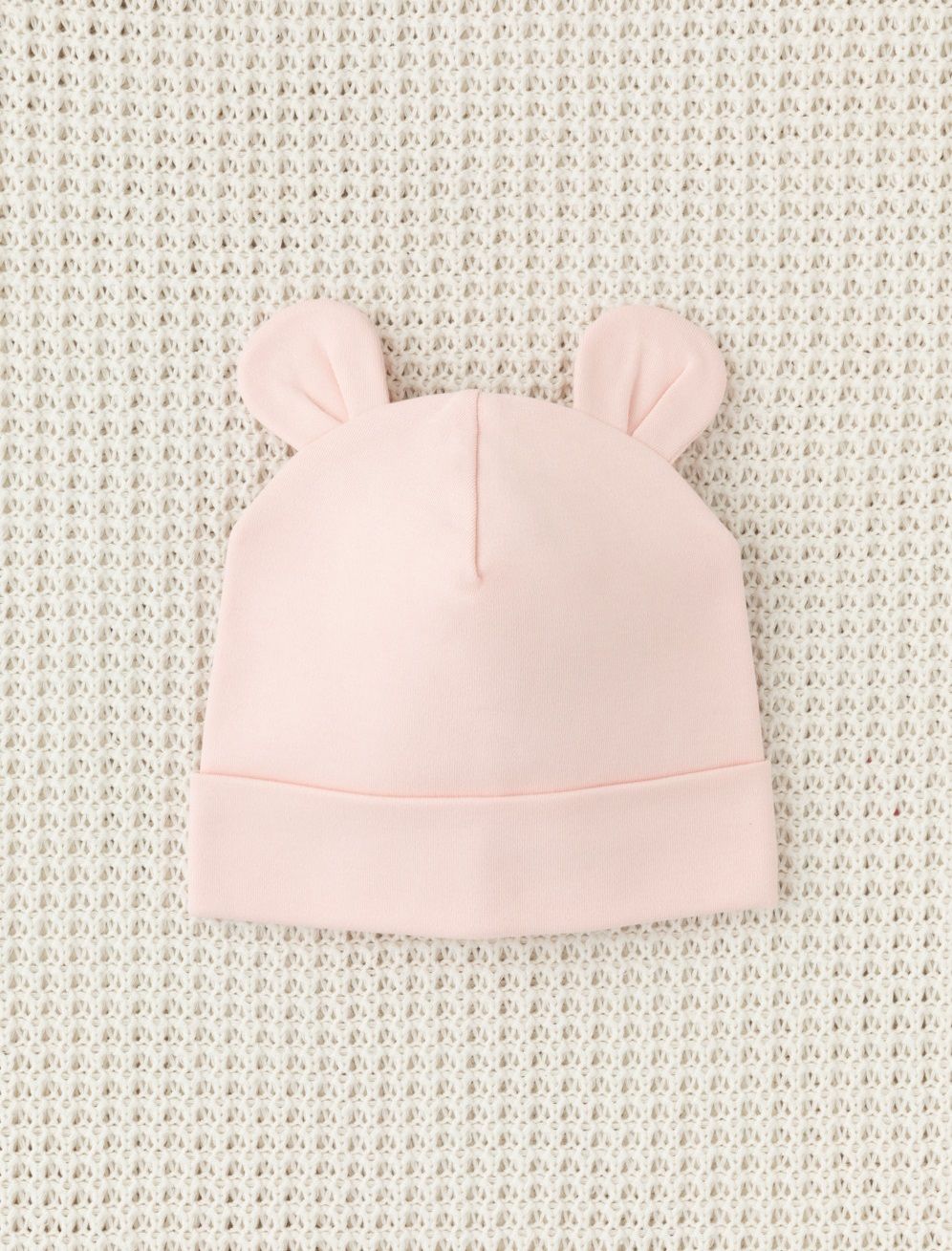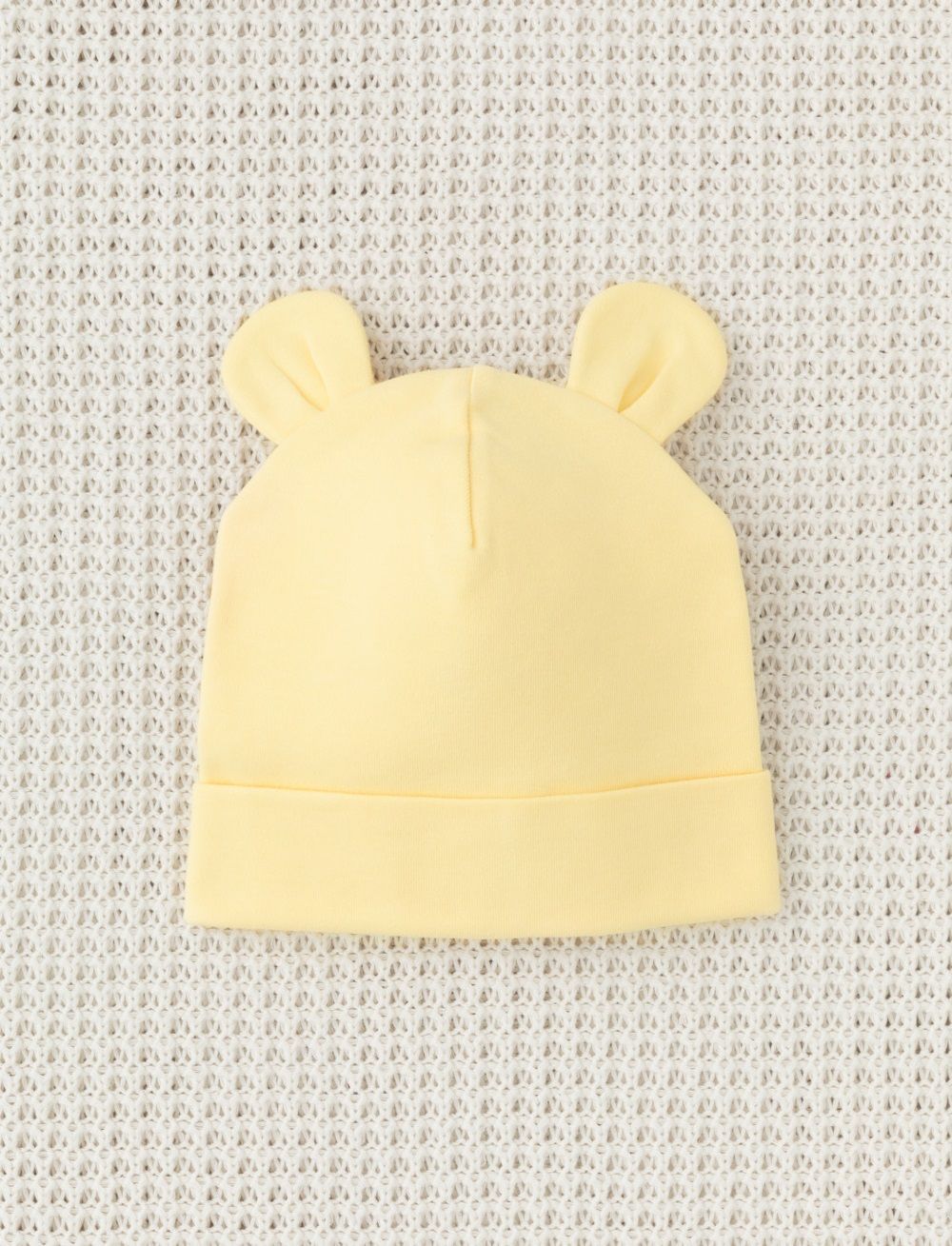 Состав: 100% хлопок. Шапка с отворотом для новорождённых из мягкого эластичного трикотажа интерлок, произведённого из натурального хлопка. Украшена декоративными ушками. Все трикотажные полотна производятся в соответствии с нормами Швейцарского сертификата ЭкоТекс.