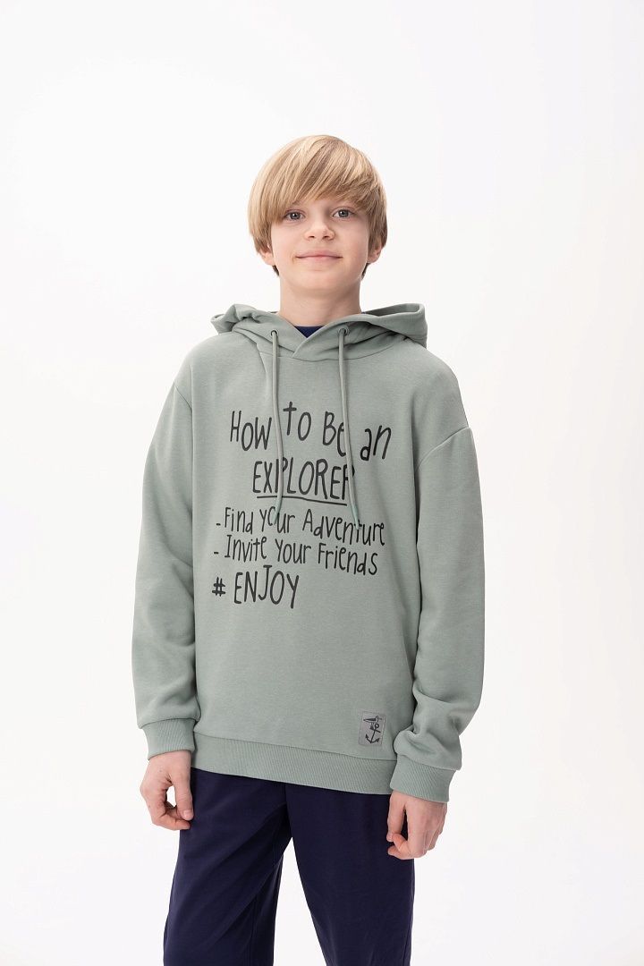Состав: 87%хлопок 13%полиэстер Худи для мальчика без начеса – актуальная вещь в любом сезоне, будь то весна, лето или осень. Кофта спортивная для мальчика выполнена из плотного футера-петля, который отлично согревает в прохладную погоду и при этом хорошо пропускает воздух – ребенок активно двигается, играет, не потеет. Толстовка свободного покроя оверсайз со спущенным плечом, углубленной проймой. Рукава а также низ изделия на манжете из рибаны. Кофта без карманов. Капюшон с регулировкой объема. По переду изделие украшено принтом с надписью и нашивкой. Перевод надписей "how to be an explorer: find your adventure, invite your friends, enjoy" - как стать исследователем: найди свое приключение, пригласи своих друзей, наслаждайся. Размерный ряд подходит как для малышей так и для подростков.