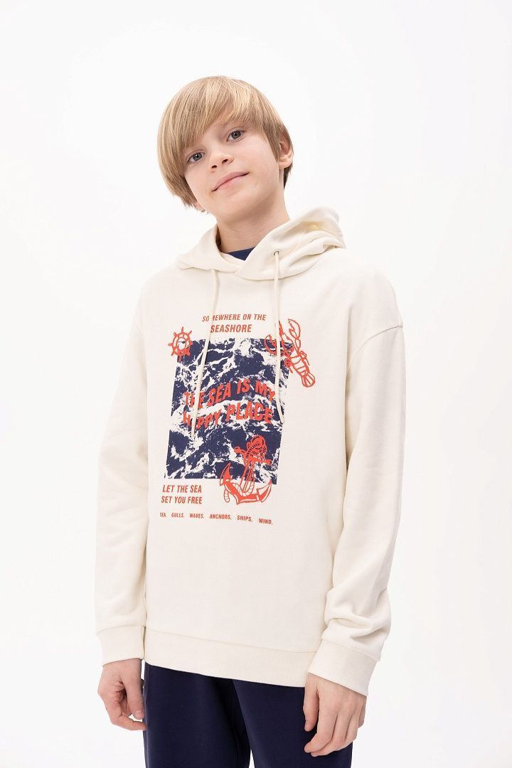 Состав: 87%хлопок 13%полиэстер Худи для мальчика без начеса – актуальная вещь в любом сезоне, будь то весна, лето или осень. Кофта спортивная для мальчика выполнена из плотного футера-петля, который отлично согревает в прохладную погоду и при этом хорошо пропускает воздух – ребенок активно двигается, играет, не потеет. Толстовка свободного покроя оверсайз со спущенным плечом, углубленной проймой. Рукава а также низ изделия на манжете из рибаны. Кофта без карманов. Капюшон с регулировкой объема. По переду изделие украшено принтом с надписью. Перевод надписей "somewhere on the seashore" - где-то на побережье, "the sea is my happy place" - море-мое счастливое место, "let the sea set you free" - позвольте морю освободить вас, "sea.gulls.waves.anchors.ships.wind" - море.чайки.волны.якоря.корабли.ветер. Размерный ряд подходит как для малышей так и для подростков.