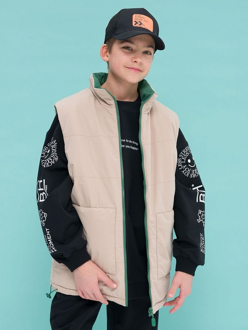 Состав: 100%полиэстер+мембрана, подклад: 100%полиэстер+мембрана, утеплитель: 100%полиэстер Двусторонний жилет для мальчика увеличенного объема, удлиненный, с увеличенной проймой. Жилет утепленный (синтепон 60г/м2 в два слоя) c горизонтальной отстрочкой. Наличие в составе ткани мембраны делает жилет максимально комфортным при носке. Курточная ткань с водоотталкивающим покрытием. Рекомендуемый температурный режим: не ниже +5°С. Тракторная молния максимально прочная, не заедает. На воротнике защита подбородка и шеи от защемления молнией. Понизу утяжка эластичным шнуром с пластиковыми стопперами - можно менять силуэт. Большие накладные карманы со входом в карман сбоку. Оригинальная тканевая нашивка на спинке - имитация этикетки.
