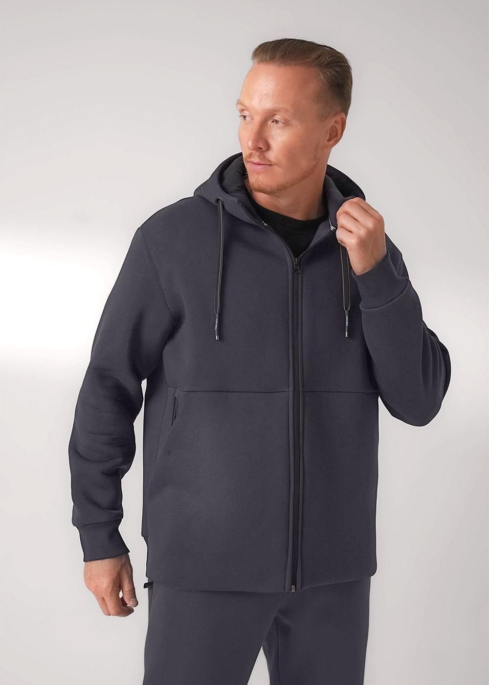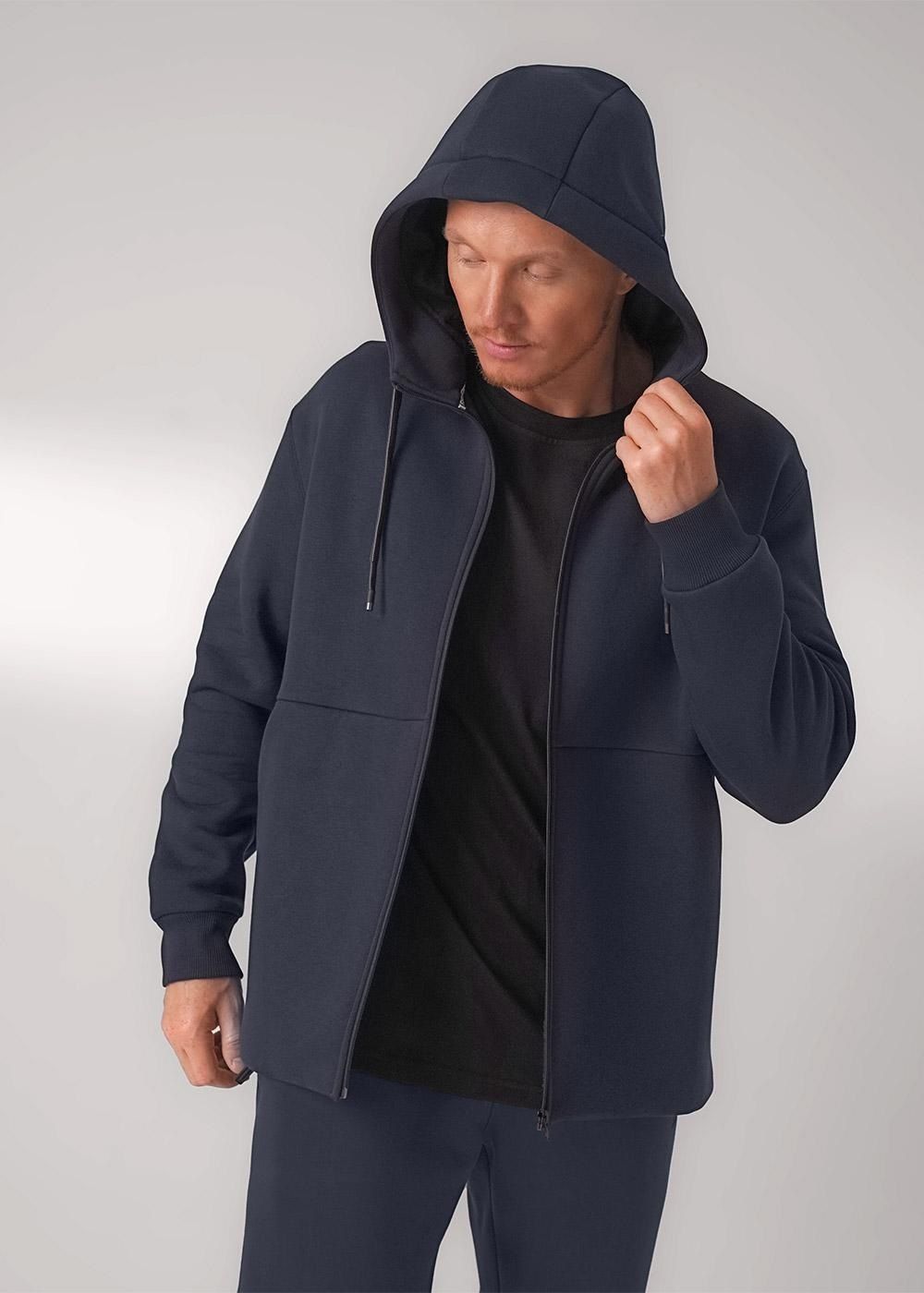 Состав: 65% хлопок, 35% полиэстер. Тёплая мужская трикотажная куртка на молнии с капюшоном и вместительными карманами. Произведена из мягкого трикотажного футер с начёсом, дополнена дизайнерским принтом. Удобный и практичный вариант на каждый день.