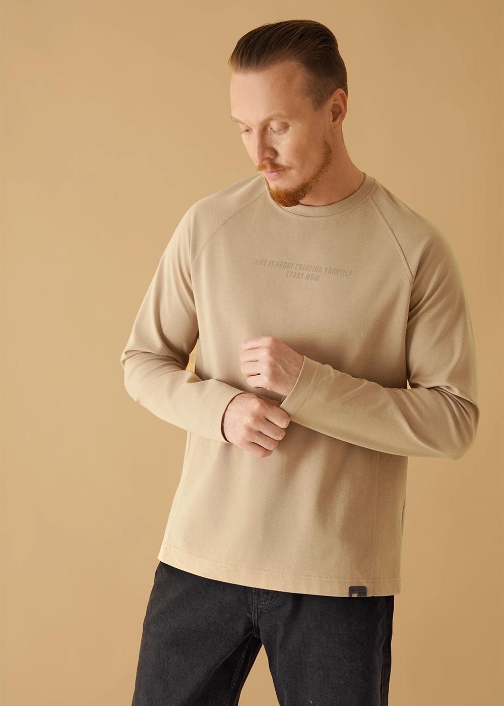 Состав: 53% хлопок, 47% полиэстер. Стильный мужской лонгслив из трикотажного полотна. Изделие с круглым вырезом горловины и длинным рукавом реглан, в качестве отделки имиджевый принт и фурнитура. Отличный вариант на каждый день.