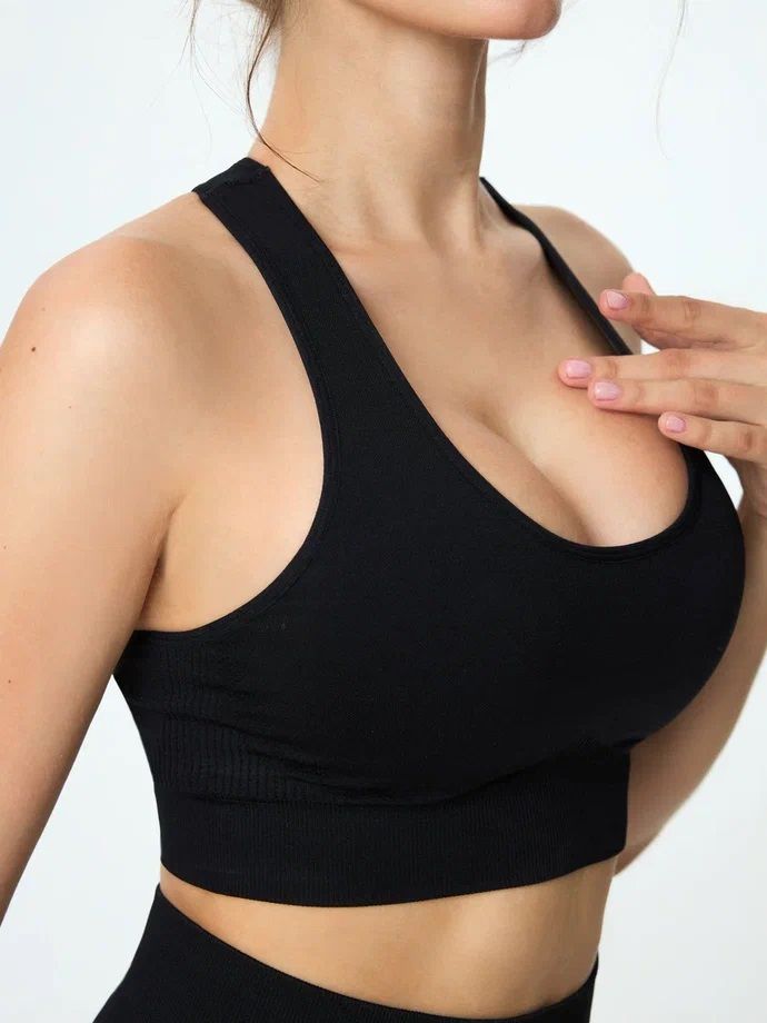 Состав: 95% полиамид; 5% эластан. Бесшовный, спортивный топ бра со съемными чашечками