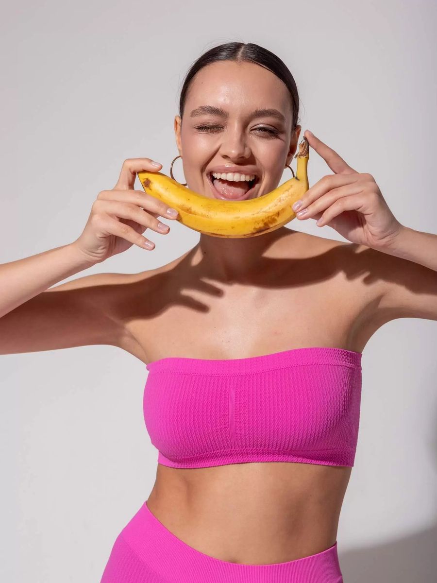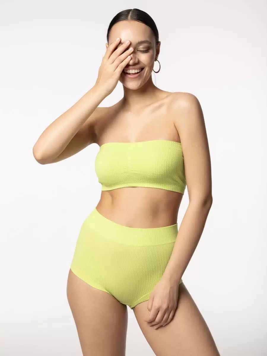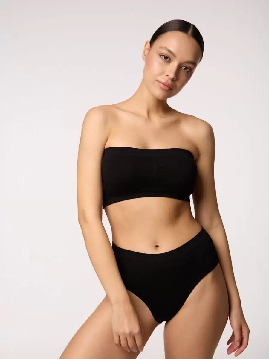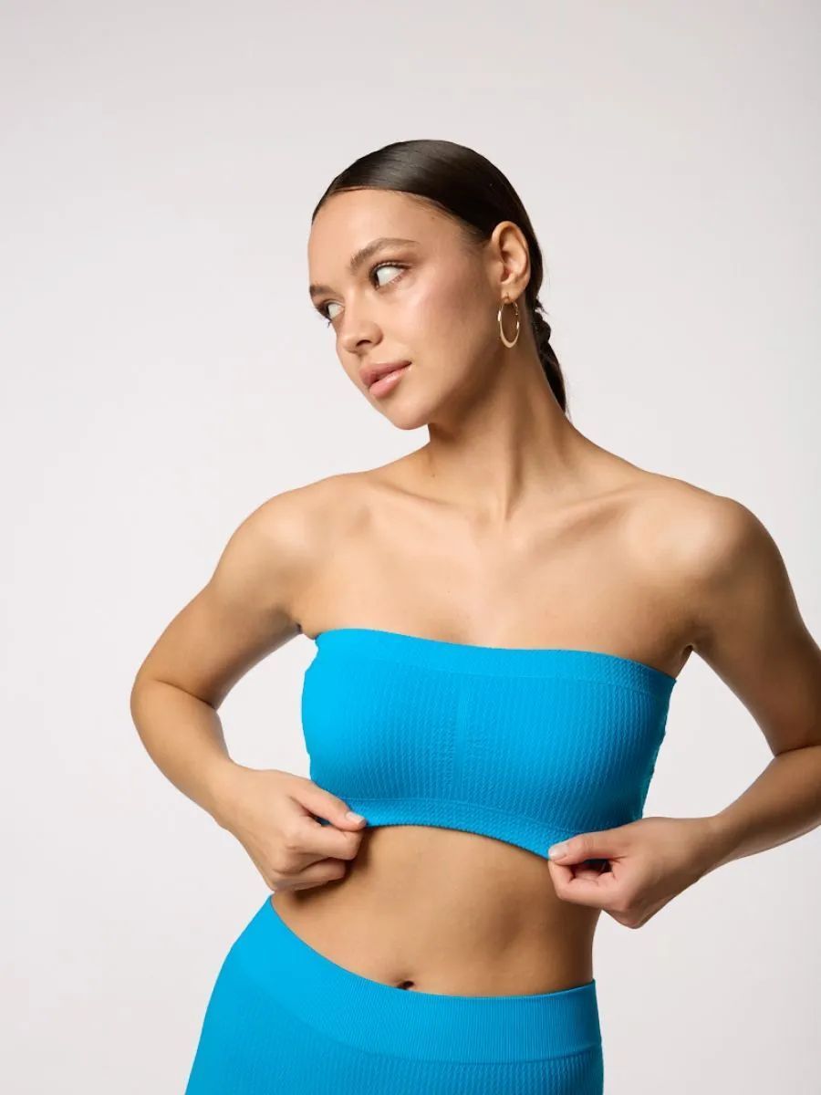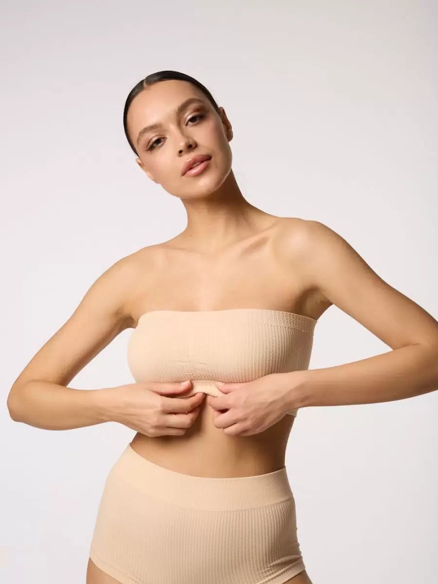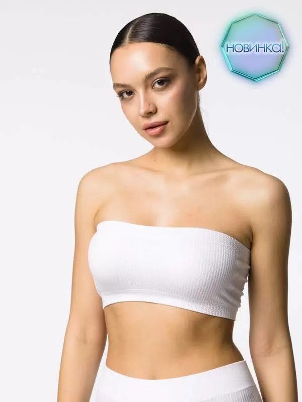 Состав: 90% полиамид; 10% эластан. Бесшовный топ бандо с вкладышами выполнен из тянущегося материала