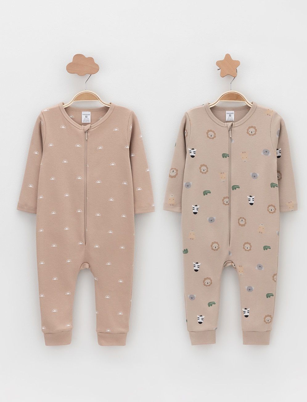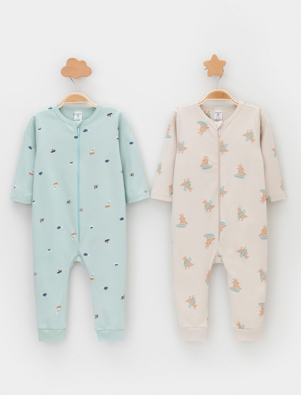 Состав: 100% хлопок. Комбинезоны для новорождённых из мягкого эластичного трикотажа интерлок, произведённого из натурального хлопка. В упаковке 2 штуки. Застёгиваются спереди на молнию, предусмотрена защита подбородка. Оригинальная набивка выполнена из стойких гипоаллергенных текстильных красителей. Все трикотажные полотна производятся в соответствии с нормами Швейцарского сертификата ЭкоТекс.