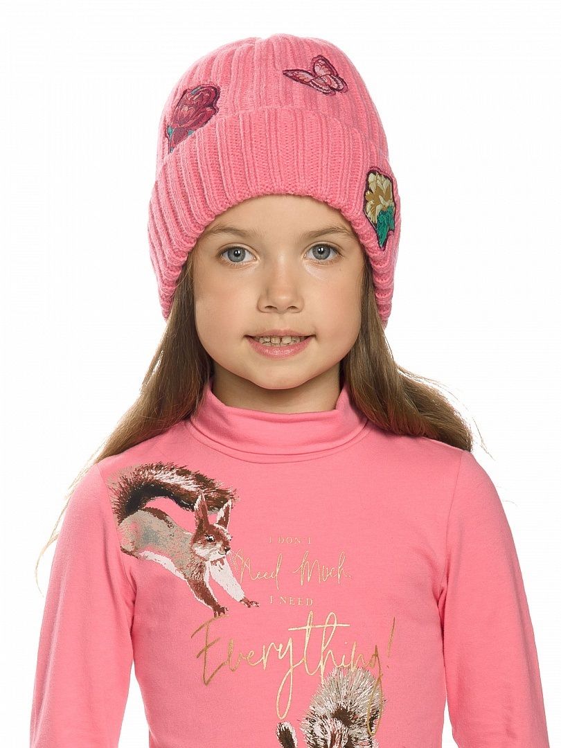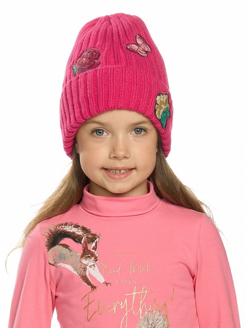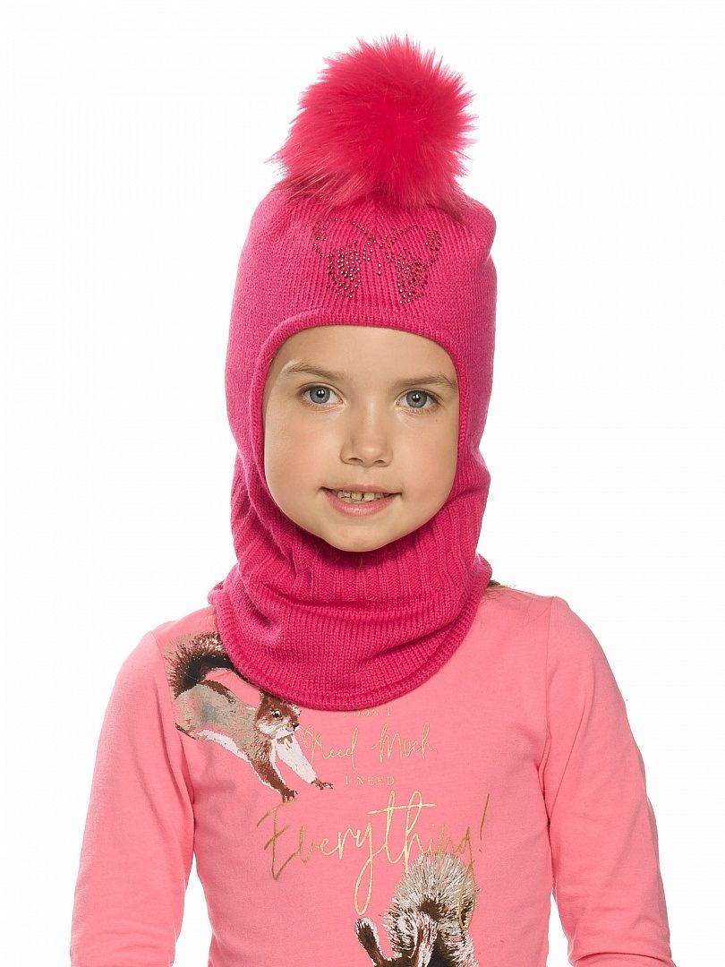 Состав: 100%акрил, подклад: 100%полиэстер Шапка для девочек. Вязаная шапка-капор на подкладе из флиса. Аппликация-бабочка из страз; помпон из искусственного меха.