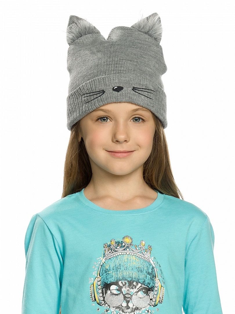 Состав: 100%акрил, подклад: 100%акрил Шапка для девочек. Шапка двойной вязки с отворотом; вид вязки риб 3*3. Вышивка в виде кошачьей мордочки; декоративные ушки с искусственным мехом.