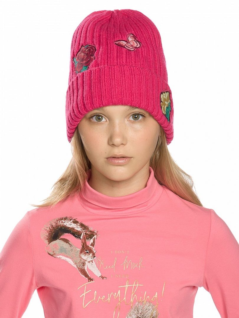 Состав: 100%акрил, подклад: 100%полиэстер Шапка для девочек. Вязаная шапка на подкладе из флиса, с отворотом. Декоративные нашивки.