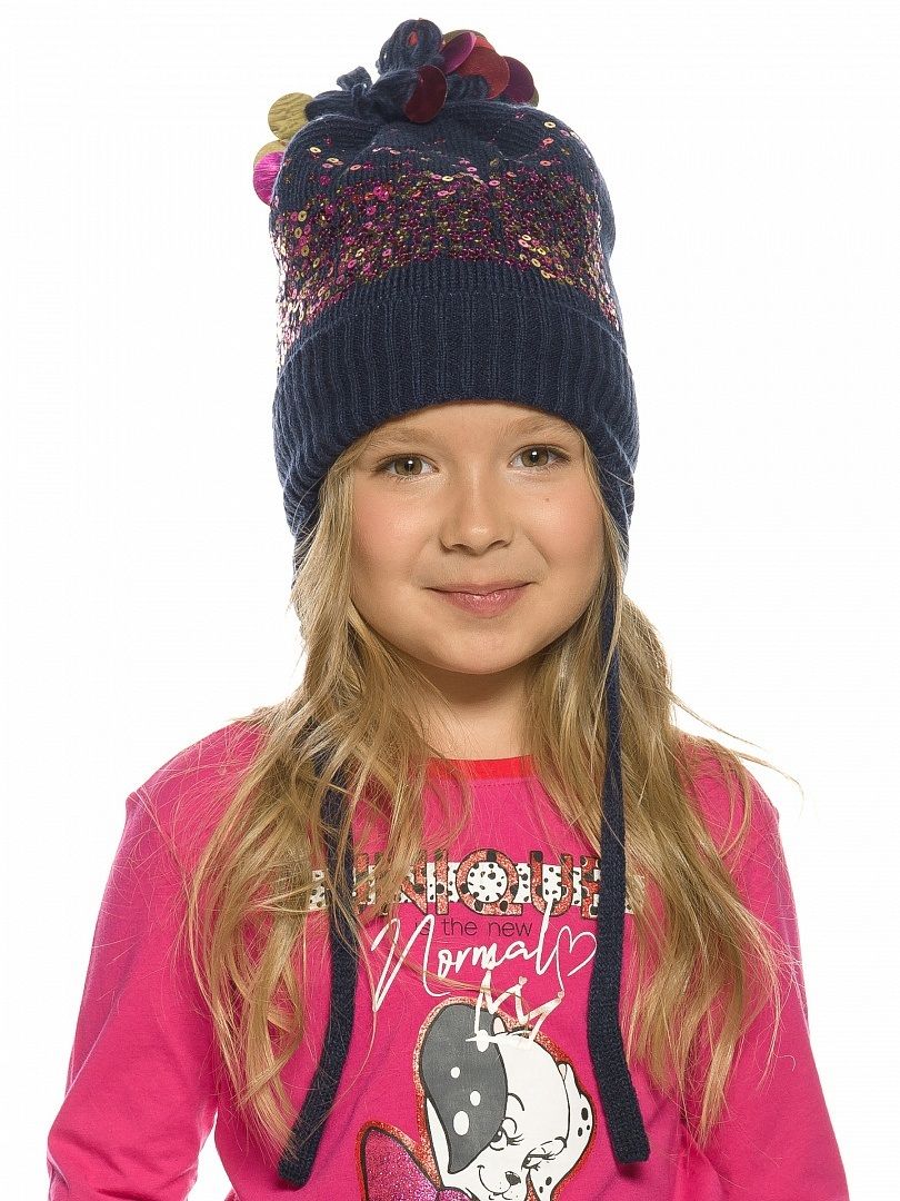 Состав: 100%акрил, подклад: 100%полиэстер Шапка для девочек. НОВЫЙ необычный помпон с крупными пайетками. Вязаная шапка на флисе с отворотом. Двойные ушки с завязками придают особое тепло и уют для самых маленьких, по переду изделия разноцветные пайетки.