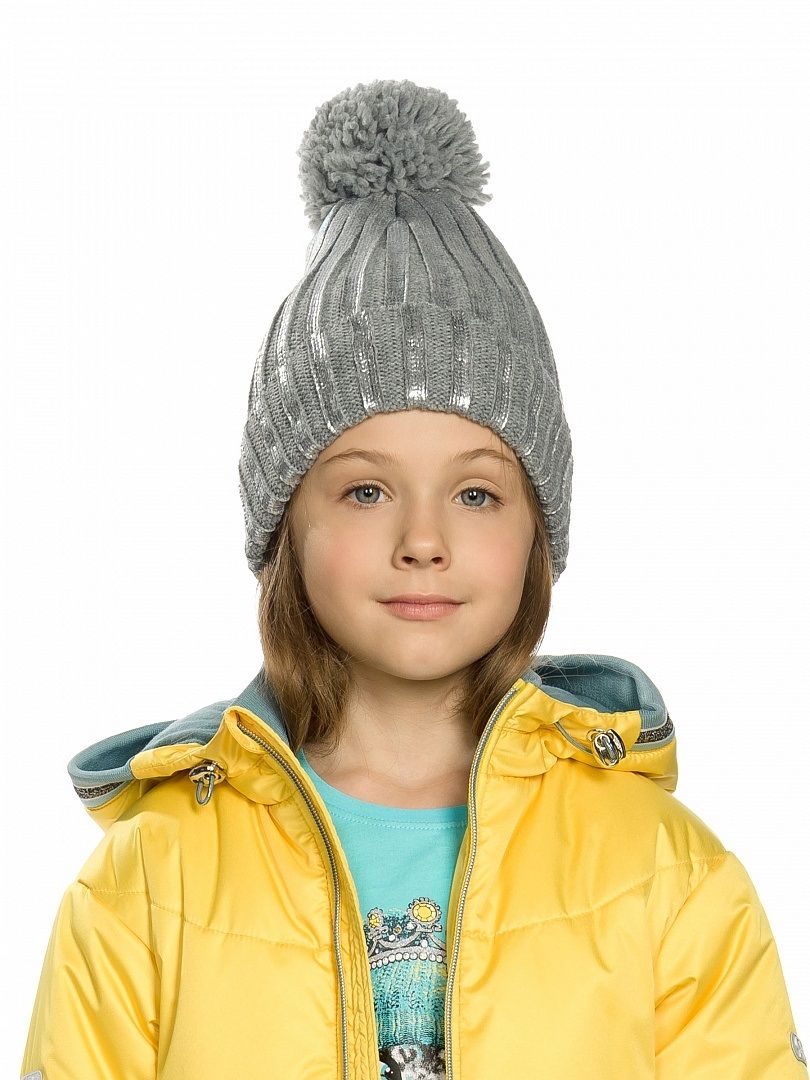 Состав: 100%акрил, подклад: 100%полиэстер Шапка для девочек. Шапка двойной вязки с отворотом; вид вязки риб 3*3. Декор: серебряное напыление и большой помпон, собранный из толстой пряжи.