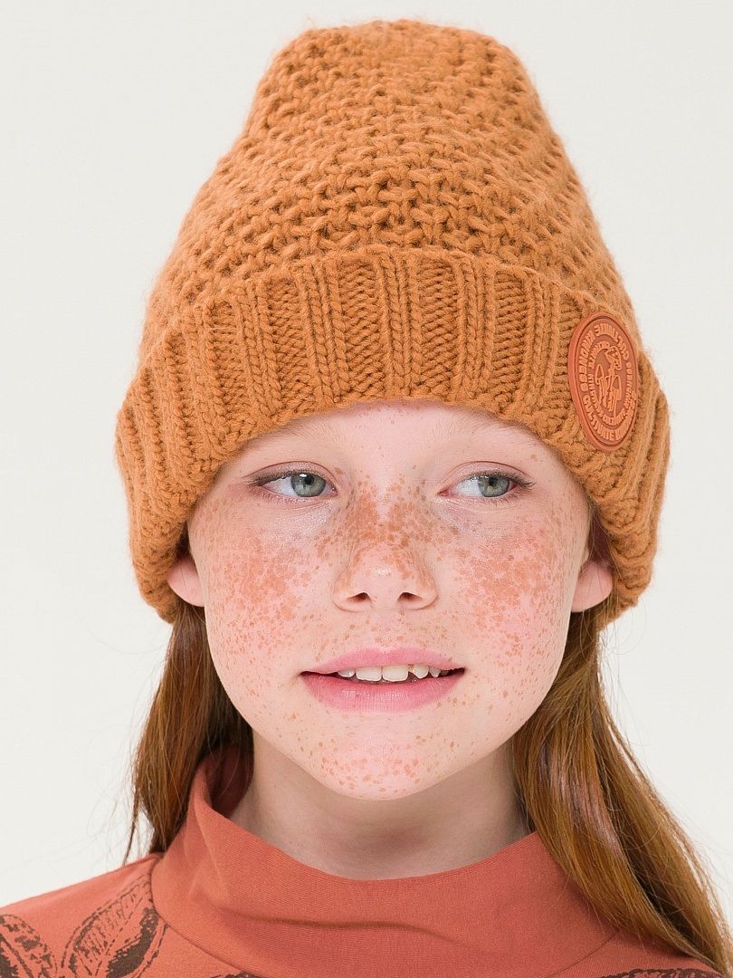 Состав: 100%акрил, подклад: 100%полиэстер Вязанная шапка из акрила с отворотом и подкладом из флиса для девочки. Идеальная посадка по голове, плотно прилегает к ушам, защищает от холода и ветра. Шапку украшает необычный фактурный рисунок вязки, который имитирует фактуру лесных шишек. Цвет шапки - актуальный цвет вареной сгущенки. Сбоку резиновая нашивка в тон. Перевод "культивируй доброту".