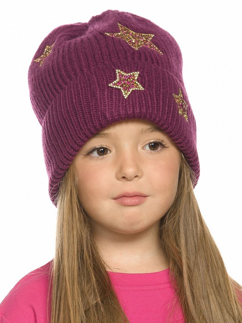 Состав: 100%акрил, подклад: 100%полиэстер Шапка для девочек вязкой 1*1 с отворотом, на подкладе из флиса. Форма немного вытянута, но хорошо держит форму. Декор в виде звёзд из страз.