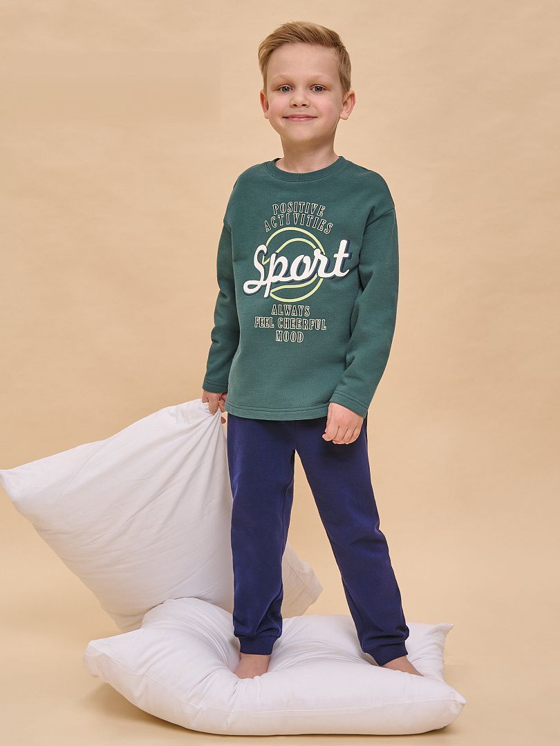 Состав: верх: 100%хлопок, низ: 100%хлопок Пижама детская для мальчика утепленная. Натуральный состав ткани из 100% хлопка (футер с начёсом) обеспечивает изделию мягкость, гипоаллергенность и воздухопроницаемость. Благодаря этому сон комфортный и качественный. В пижаме из хлопка ребёнку будет тепло, даже если он сбросит одеяло. Джемпер и брюки умеренного объёма, рукава широкие и свободные — комплект для сна очень удобен. В поясе и по низу брюк мягкая и широкая резинка — не перекручивается и не давит. Отделка горловины джемпера из эластичной рибаны — ребёнку удобно надевать и снимать пижаму. А также рибана сохраняет отличную форму надолго. Хлопковая пижама украшена стильным принтом в актуальной университетской эстетике, надписи переводятся: «позитивная деятельность», «спорт!», «всегда чувствуй себя хорошо». Детская пижама для мальчика неприхотлива в уходе. Принт эластичный и мягкий, без проблем переносит частые стирки. Детская пижама с брюками подходит для сна как дома, так и в детском саду — отличный выбор для вашего ребёнка! Помните о правильном уходе за изделием: рекомендуется стирать при температуре не выше 30 °C, без предварительного замачивания, с изнанки. Это поможет сохранить качество и цвет пижамы на длительное время.Не забывайте о выборе правильного размера. Используйте таблицу размеров на фотографии, чтобы выбрать подходящий вариант для вашего мальчика.Обратите внимание, что цвет товара на экране вашего устройства может отличаться от реального.