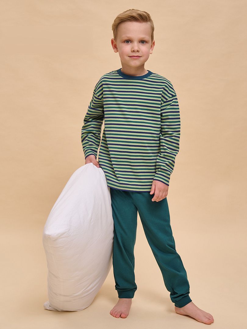 Состав: верх: 100%хлопок, низ: 100%хлопок Пижама детская для мальчика. Натуральный состав ткани (100% хлопка) обеспечивает изделию мягкость, гипоаллергенность и воздухопроницаемость. Благодаря этому сон комфортный и качественный. В пижаме из хлопка ребёнку будет тепло, даже если он сбросит одеяло. Джемпер и брюки умеренного объёма, рукава широкие и свободные — комплект для сна очень удобен. В поясе и по низу брюк мягкая и широкая резинка — не перекручивается и не давит. Отделка горловины джемпера из эластичной рибаны — ребёнку удобно надевать и снимать пижаму. А также рибана сохраняет отличную форму надолго. Хлопковая пижама лаконичного дизайна: брюки однотонные, джемпер в узкую горизонтальную полоску. Детская пижама для мальчика неприхотлива в уходе, без проблем переносит частые стирки. Детская пижама с брюками подходит для сна как дома, так и в детском саду — отличный выбор для вашего ребёнка! Помните о правильном уходе за изделием: рекомендуется стирать при температуре не выше 30 °C, без предварительного замачивания, с изнанки. Это поможет сохранить качество и цвет пижамы на длительное время.Не забывайте о выборе правильного размера. Используйте таблицу размеров на фотографии, чтобы выбрать подходящий вариант для вашего мальчика.Обратите внимание, что цвет товара на экране вашего устройства может отличаться от реального.