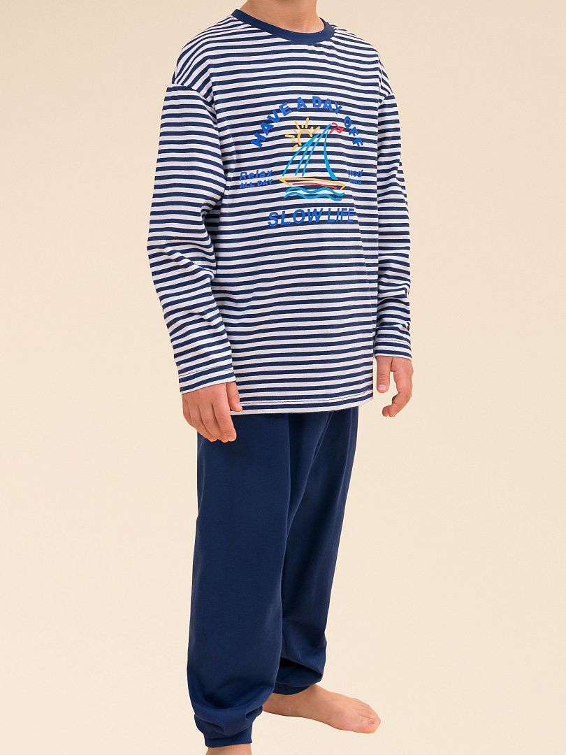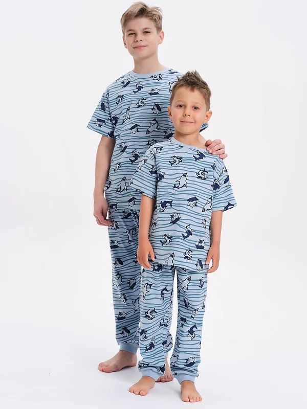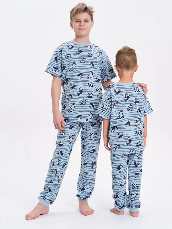 Состав: верх: 100%хлопок, низ: 100%хлопок Уютная пижама для мальчика. Изделие выполнено из 100% хлопка — идеальный вариант для детской пижамы. Ткань из хлопка приятна на ощупь и превосходно пропускает воздух, позволяя коже ребёнка дышать. В пижаме из хлопка ребёнку будет комфортно, даже если он сбросит одеяло. Футболка и брюки умеренного объёма, рукава свободные — пижама очень удобна для сна. В поясе брюк мягкая и широкая резинка — не перекручивается и не давит. Манжеты брюк и отделка горловины джемпера из эластичной рибаны — комплект удобно надевать и снимать. А также резинка отлично сохраняет форму в течение долгого времени. Пижама выполнена в all-over принт в морской тематике. Принт мягкий и эластичный, отлично переносит многочисленные стирки. Комплект подходит для сна как дома, так и в детском саду — прекрасный выбор для вашего ребёнка!
