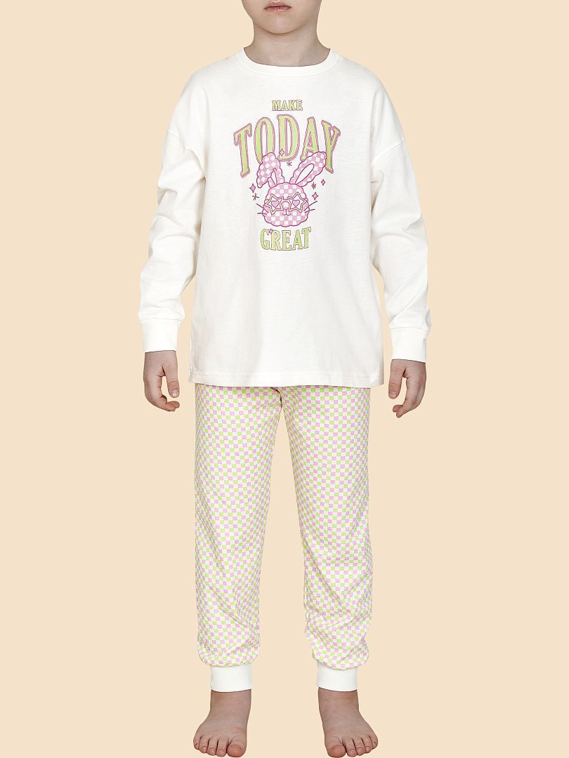 Состав: верх: 100%хлопок, низ: 100%хлопок Детская пижама для девочки. Модель выполнена из 100% хлопка — идеальный вариант для детской пижамы. Комплект для сна мягкий, гипоаллергенный и хорошо пропускает воздух. В хлопковой пижаме ребёнку будет тепло, даже если он раскроется во время сна. Всё это способствует комфортному и качественному сну. Джемпер и брюки умеренного объёма, плечо немного спущено, рукава широкие и свободные — в пижаме очень удобно спать. В поясе брюк мягкая и широкая резинка — не перекручивается и не давит. Манжеты и отделка горловины из эластичной рибаны — они не растягиваются, пижаму удобно надевать и снимать. Хлопковая пижама украшена милым принтом в виде зайчика в очках, надпись переводится: «сделай сегодняшний день отличным» — понравится любой девочке. Брюки декорированы сплошным принтом в мелкую клетку. Детская пижама неприхотлива в уходе. Принт эластичный и мягкий, легко переносит частые стирки. Детская пижама с брюками подходит для сна как дома, так и в детском саду — отличный выбор для вашего ребёнка! Помните о правильном уходе за изделием: рекомендуется стирать при температуре не выше 30 °C, без предварительного замачивания, с изнанки. Это поможет сохранить качество и цвет пижамы на длительное время.Не забывайте о выборе правильного размера. Используйте таблицу размеров на фотографии, чтобы выбрать подходящий вариант для вашей девочки.Обратите внимание, что цвет товара на экране вашего устройства может отличаться от реального.