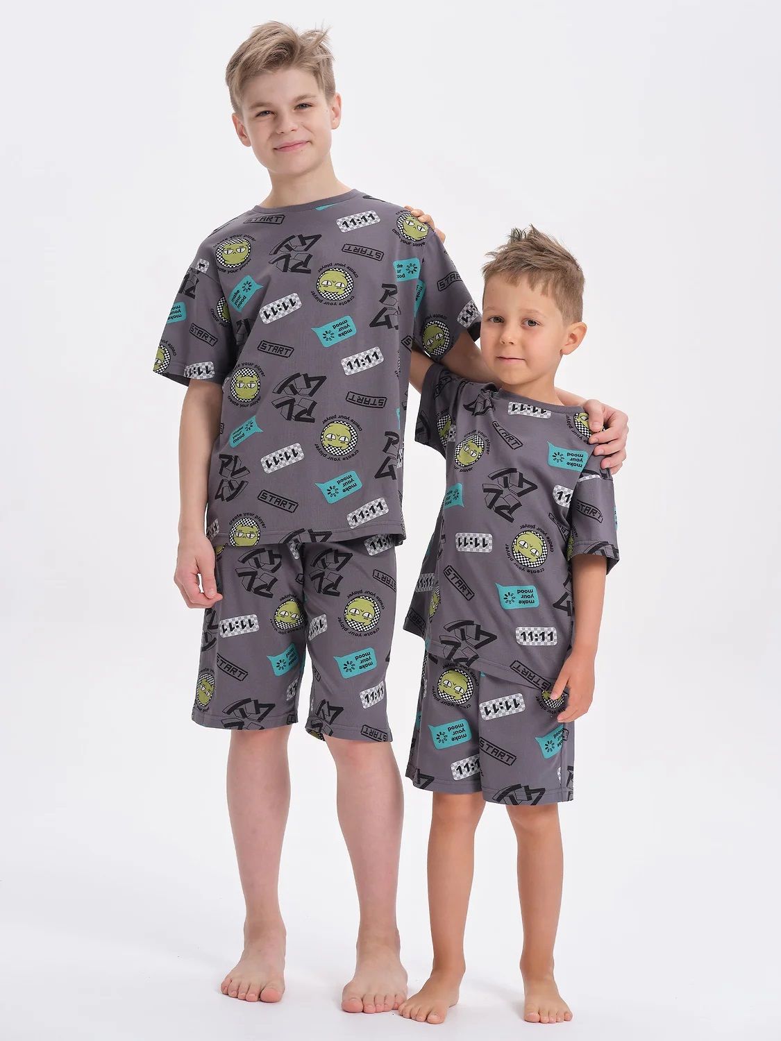 Состав: верх: 100%хлопок, низ: 100%хлопок Стильная и уютная пижама для мальчика. В составе ткани 100% хлопка — идеально для детской одежды! Модель приятна на ощупь, прекрасно пропускает воздух, позволяя коже ребёнка дышать. При этом в пижаме из хлопка ребёнку будет уютно, даже если он сбросит одеяло. Всё это обеспечивает комфортный и качественный сон. Футболка и удлиненные шорты, плечо спущено, рукава широкие и свободные — пижама на мальчика очень удобна для сна. Широкая и мягкая резинка в поясе не перекручивается и не давит. Отделка горловины из эластичной рибаны — она не растягивается, ребёнку удобно надевать и снимать пижаму. Перевод надписей: "создай себе настроение", "создай своего игрока", "творец", "игра". Хлопковый комплект идеален для сна и отдыха дома — прекрасный выбор для вашего ребёнка! Пижама с шортами для мальчика подходит для круглогодичного использования. Домашний комплект — замечательный подарок сыну, внуку, брату на любой праздник. Выбирайте нужный размер по таблице размеров на фото. Цвет товара на экране вашего устройства может отличаться от цвета изделия вживую.