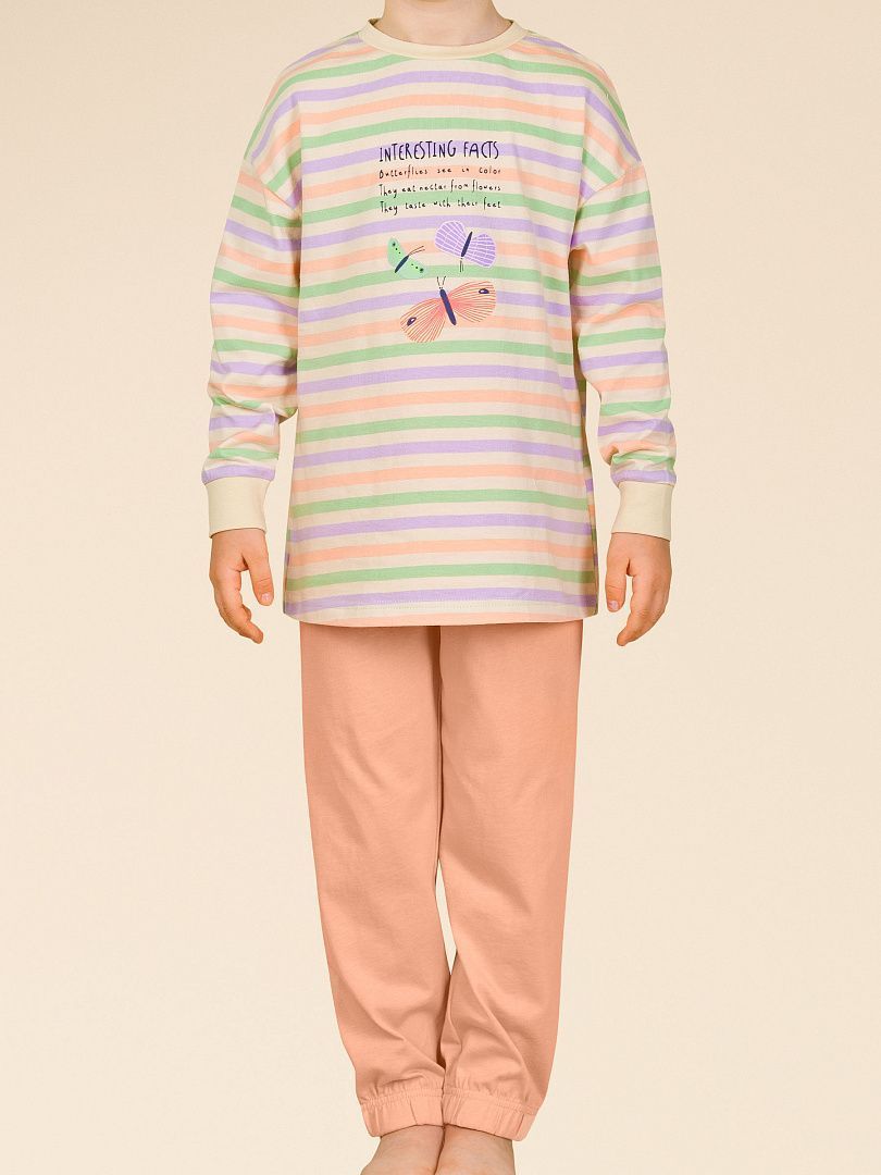 Состав: верх: 100%хлопок, низ: 100%хлопок Стильная и уютная пижама в нежных пастельных оттенках для девочки. В составе ткани 100% хлопка — идеально для детской одежды! Модель приятна на ощупь, прекрасно пропускает воздух, позволяя коже ребёнка дышать. При этом в пижаме из хлопка ребёнку будет тепло, даже если он сбросит одеяло. Всё это обеспечивает комфортный и качественный сон. Джемпер и брюки среднего объёма, плечо немного спущено, рукава широкие и свободные — в пижаме очень удобно спать. Широкая и мягкая резинка в поясе не перекручивается и не давит. Манжеты и отделка горловины из эластичной рибаны — она не растягивается, ребёнку удобно надевать и снимать пижаму. Брюки однотонные, персикового цвета. Джемпер в полоску украшает милый принт в виде бабочек. Надписи переводятся: "интересные факты", "бабочки видят в цвете", "они питаются нектаром с цветов", "вкусовые рецепторы у них находятся на лапках". В линейке представлены детские пижамы следующих размеров: 1 (86); 2 (92); 3 (98); 4 (104); 5 (110); 6 (116); 7 (122); 8 (128); 9 (134); 10 (140); 11 (146). Хлопковый комплект идеален для сна как дома, так и в детском саду — прекрасный выбор для вашего ребёнка! Пижама с брюками подходит для круглогодичного использования. Домашний комплект — замечательный подарок дочке, внучке, сестре на любой праздник. Выбирайте нужный размер по таблице размеров на фото. Цвет товара на экране вашего устройства может отличаться от цвета изделия вживую.