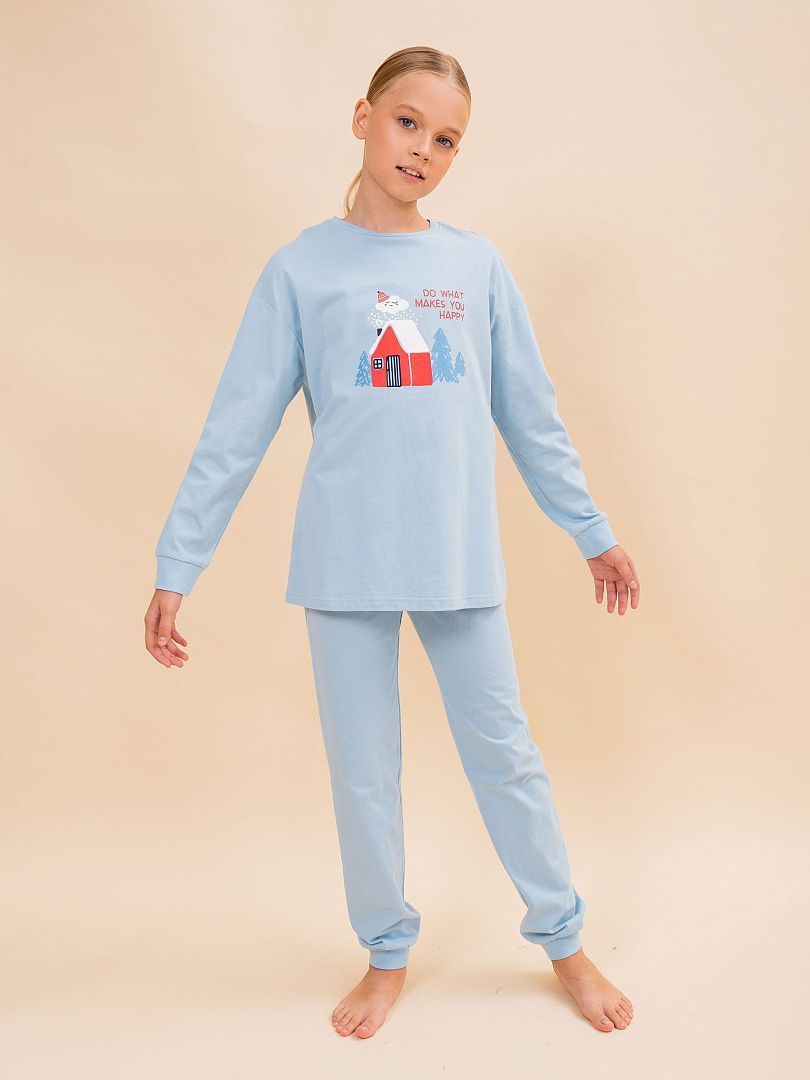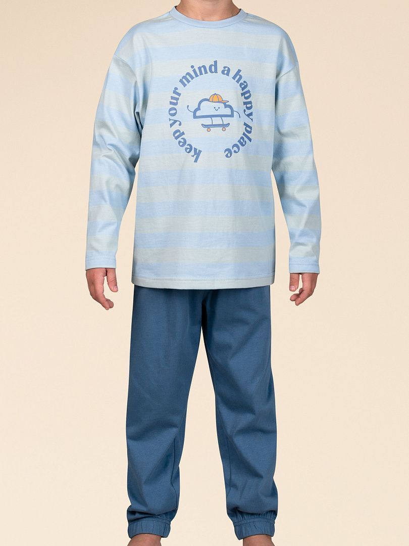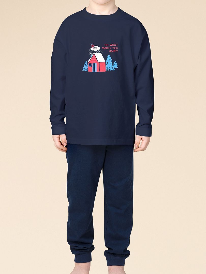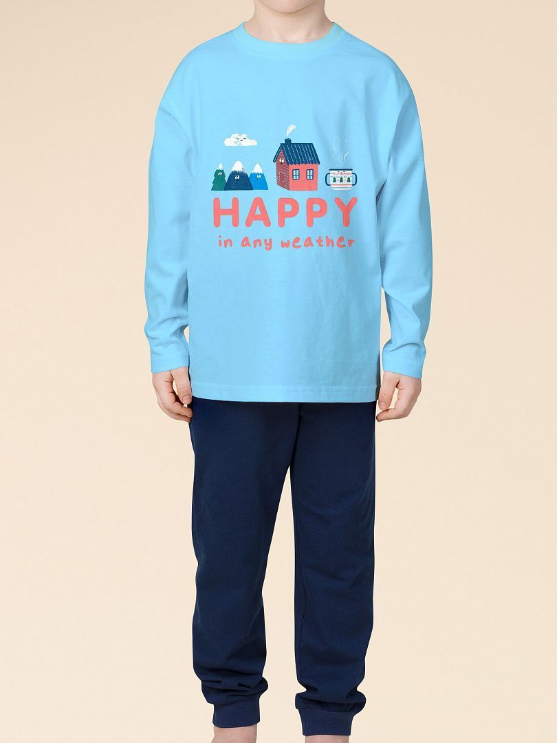 Состав: верх: 100%хлопок, низ: 100%хлопок Плюс 100 к уюту с нашей стильной пижамой для мальчика! Модель в стиле "хюгге" выполнена из 100% хлопка — оптимальный состав для детской пижамы. Изделие мягкое, отлично пропускает воздух, позволяя коже ребёнка дышать. При этом в пижаме из хлопка ребёнку будет комфортно, даже если он сбросит одеяло во сне. Джемпер и брюки среднего объёма, рукава свободные — в пижаме очень удобно спать. Широкая и мягкая резинка в поясе не перекручивается и не давит. Манжеты брюк и отделка горловины джемпера из эластичной рибаны — они не растягиваются, пижаму удобно надевать и снимать. Брюки выполнены в трендовом синем цвете и лаконичном дизайне. Джемпер голубого цвета декорирован уютным принтом с позитивным текстом. Перевод: "Счастлив в любую погоду". Принт мягкий и эластичный, прекрасно переносит частые стирки. Такая пижама идеальна для игр, сна как дома, так и в детском саду — прекрасный подарок любому мальчику. Станет замечательным подарком, который способен вызвать искреннюю радость у вашего сына, внука, племянника, оставив