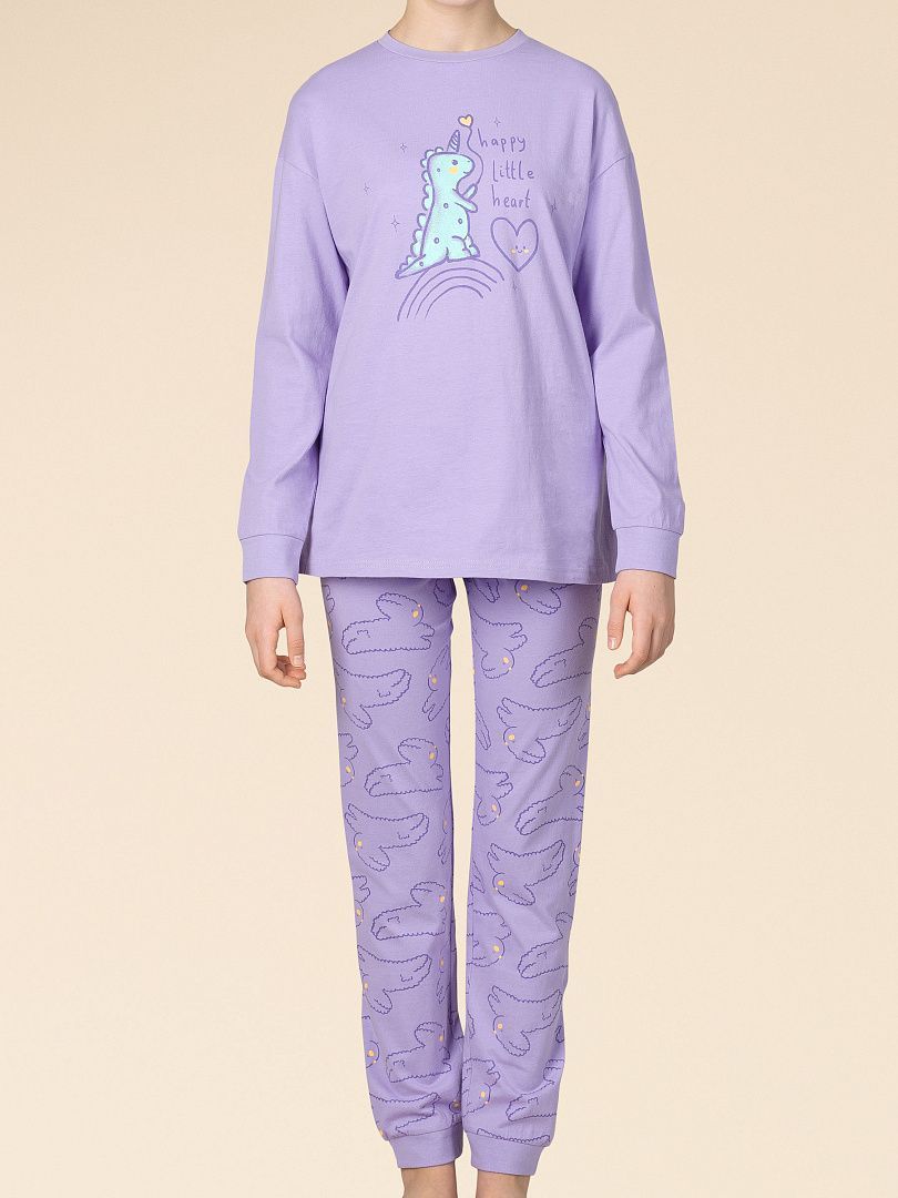 Состав: верх: 100%хлопок, низ: 100%хлопок Красивая и уютная пижама супертрендового сиреневого цвета для девочки. В составе ткани 100% хлопка — идеально для детской одежды! Модель приятна на ощупь, прекрасно пропускает воздух, позволяя коже ребёнка дышать. При этом в пижаме из хлопка ребёнку будет комфортно, даже если он сбросит одеяло во сне. Всё это обеспечивает комфортный и качественный сон. Джемпер и брюки среднего объёма, плечо немного спущено, рукава широкие и свободные — в пижаме очень удобно спать, играть. Широкая и мягкая резинка в поясе не перекручивается и не давит. Манжеты и отделка горловины из эластичной рибаны — они не растягиваются, ребёнку удобно надевать и снимать пижаму. Брюки украшает принт в виде милых зверят, а джемпер декорирован принтом в виде дракончика-единорога — ни одна девочка не останется равнодушной! Перевод: "Счастливое маленькое сердечко". Комплект подходит для сна как дома, так и в детском саду — прекрасный выбор для вашего ребёнка! Станет замечательным подарком, который способен вызвать искреннюю радо